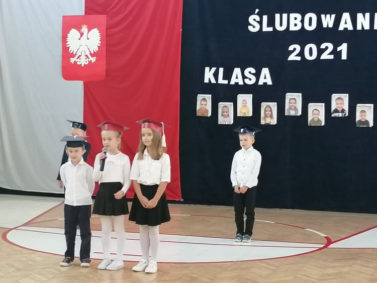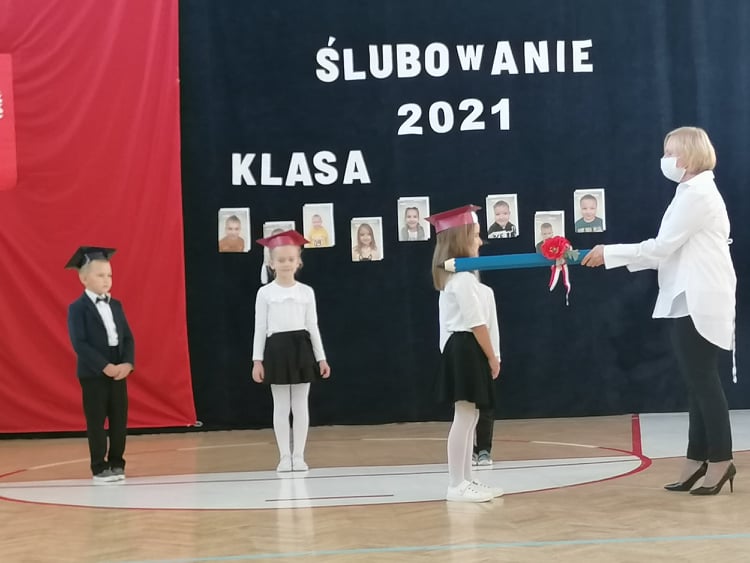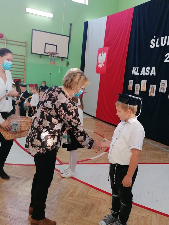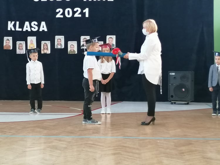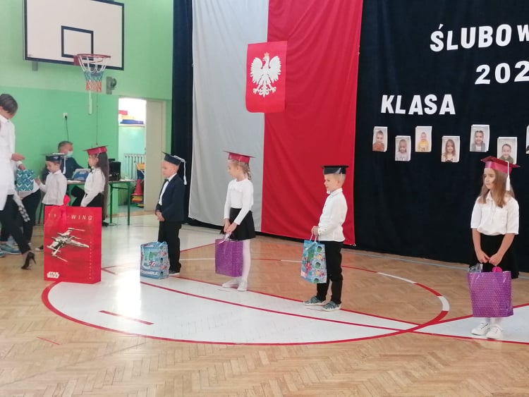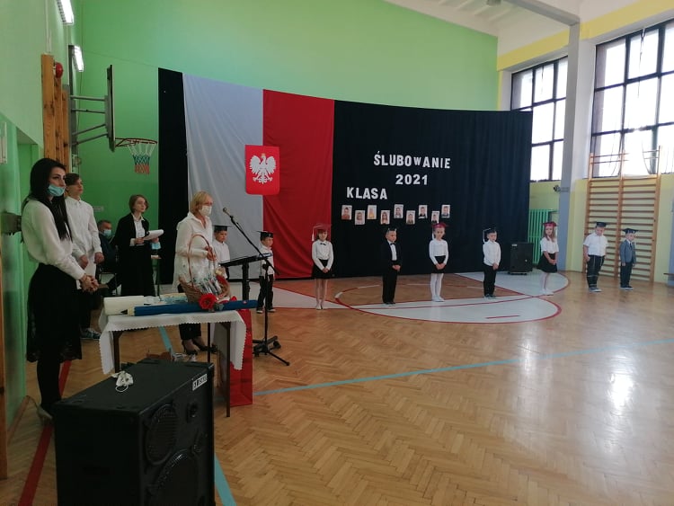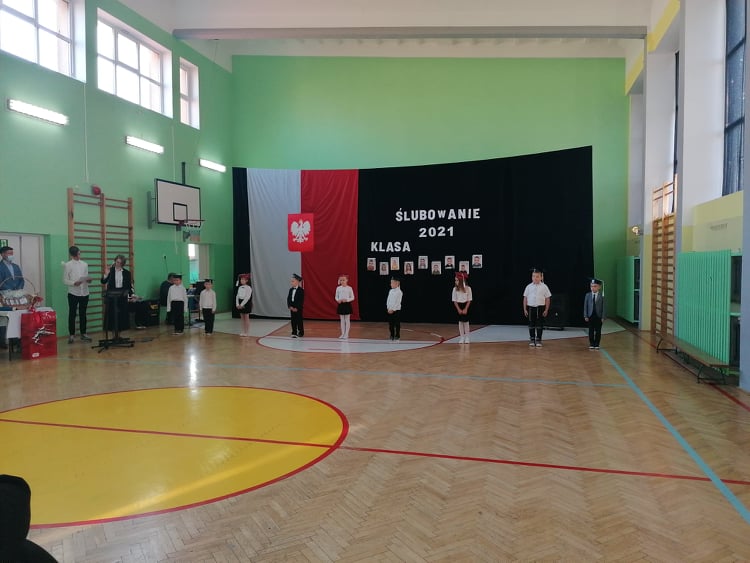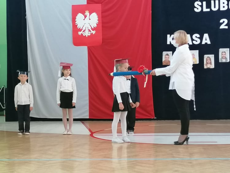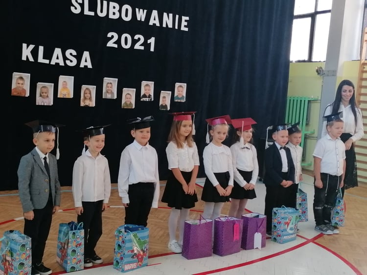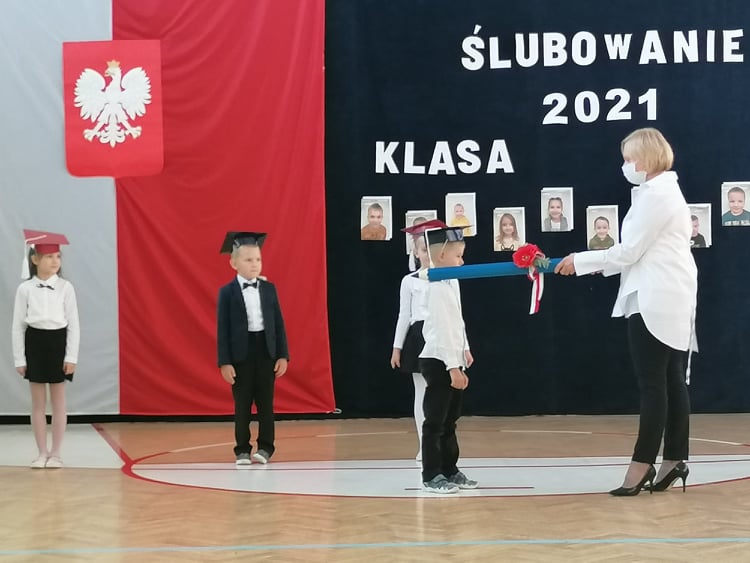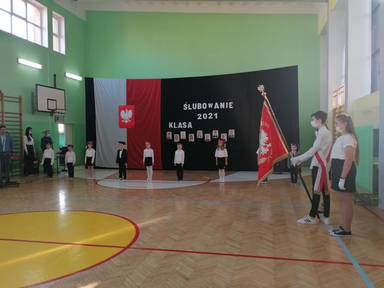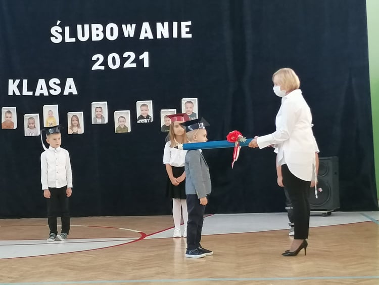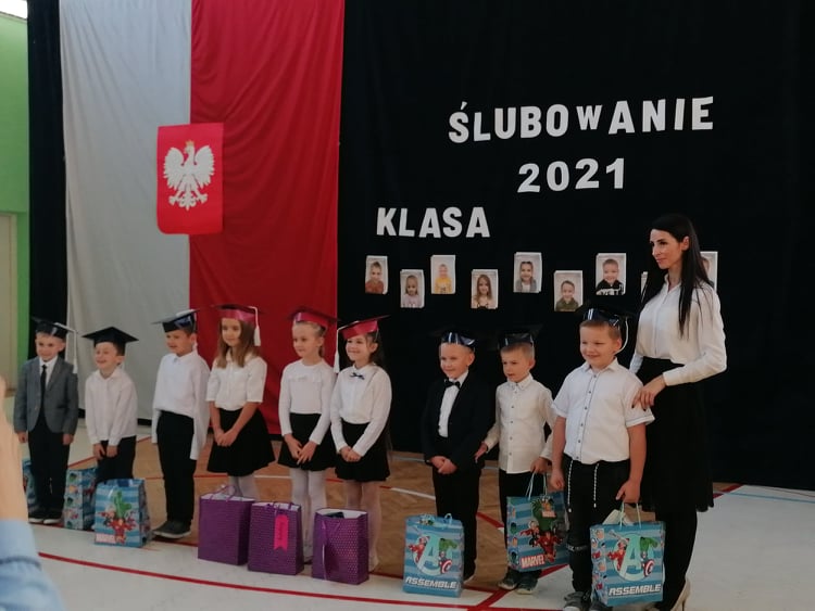 27 października 2021r. w naszej szkole od samego rana panowała świąteczna atmosfera. Uczniowie klasy I przystąpili do grona społeczności szkolnej. W uroczystościach wzięli udział rodzice, grono pedagogiczne, uczniowie oraz przedstawiciele Urzędu Miasta i Gimny Małogoszcz. Uroczystość rozpoczęła się od części artystycznej, na którą składały się wiersze oraz piosenki. Uroczystą akademię prowadzili przedstawiciele Samorządu Uczniowskiego. Po zakończonej części artystycznej w niezwykle podniosłej atmosferze, przed pocztem sztandarowym został odśpiewany hymn narodowy, a następnie pierwszoklasiści ślubowali być dobrymi Polakami, godnie reprezentować swoją szkołę, swym zachowaniem i nauką sprawiać radość rodzicom i nauczycielom. Kolorowym ołówkiem tego symbolicznego aktu dokonała pani dyrektor Olga Muszyńska. Następnie pierwszoklasiści otrzymali życzenia sukcesów w nauce i upominki od: rodziców, pani dyrektor, gości i uczniów pozostałych klasy.