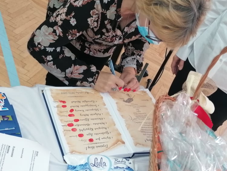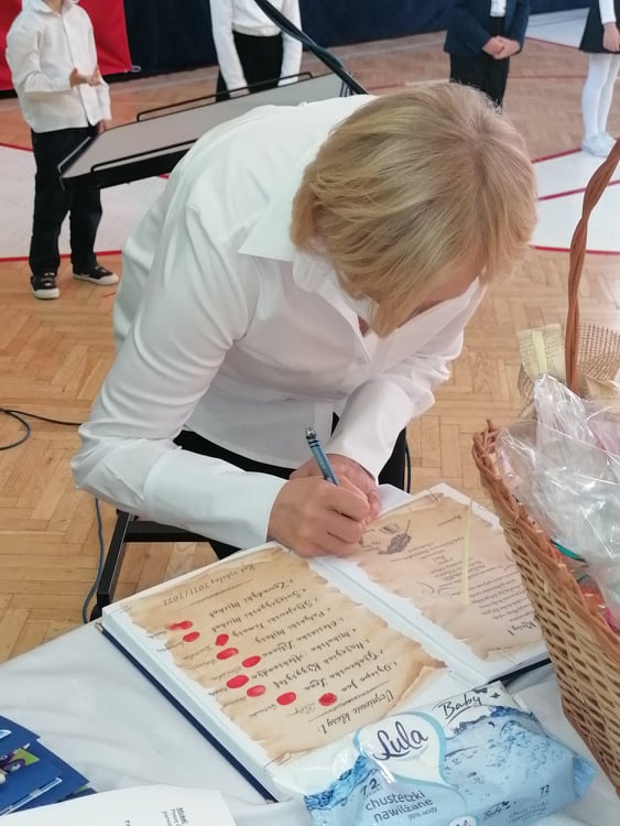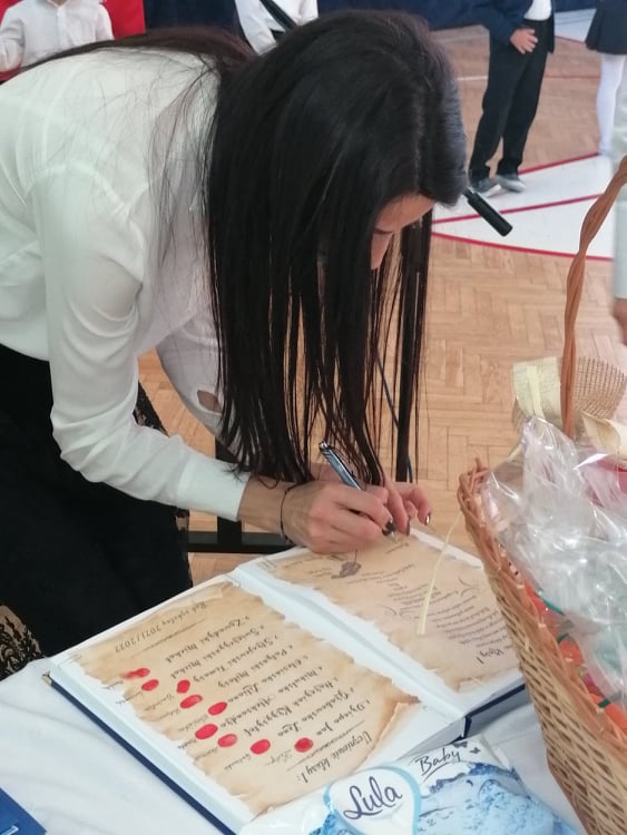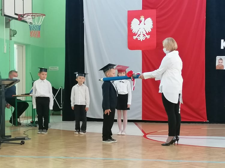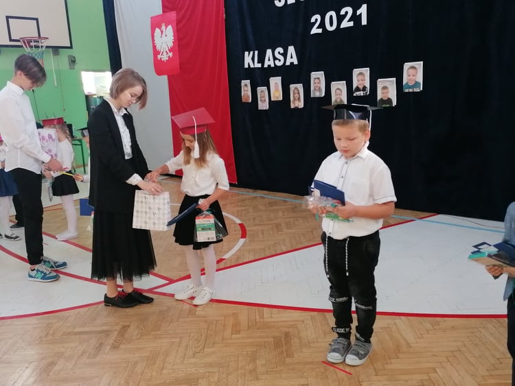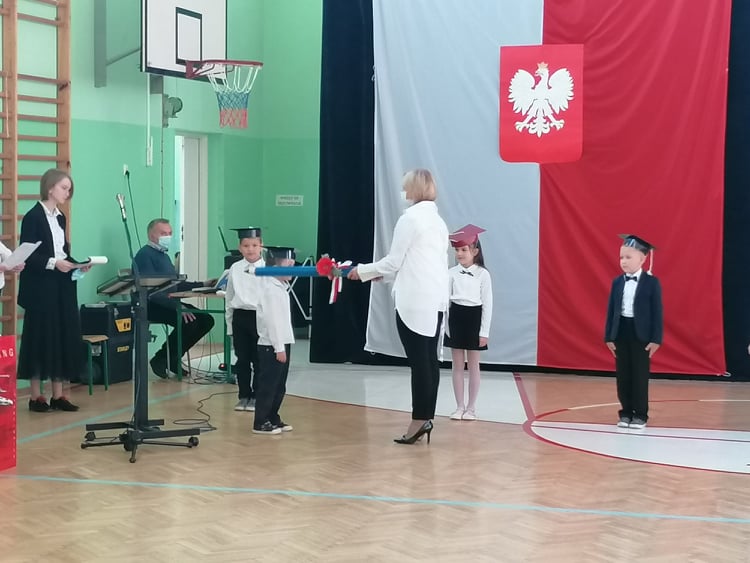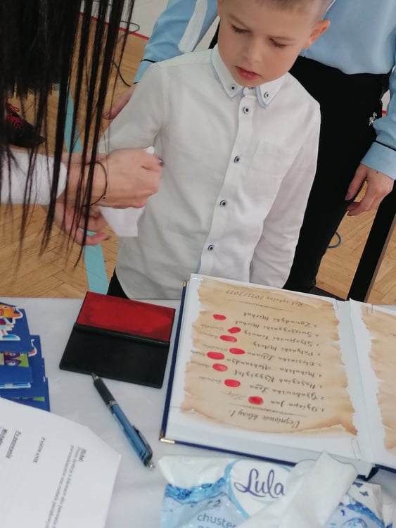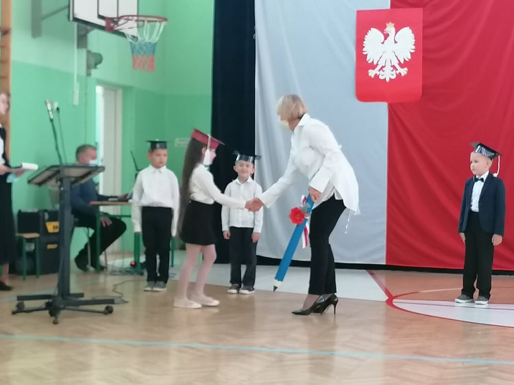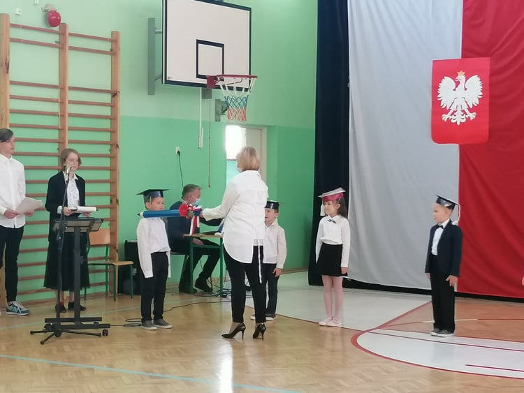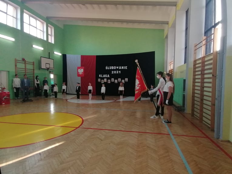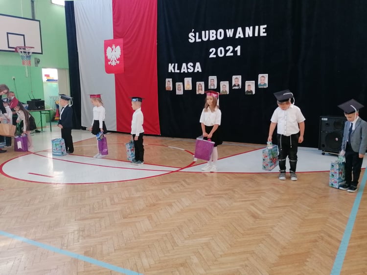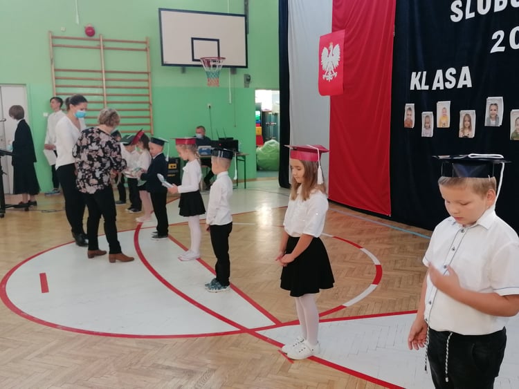 27 października 2021r. w naszej szkole od samego rana panowała świąteczna atmosfera. Uczniowie klasy I przystąpili do grona społeczności szkolnej. W uroczystościach wzięli udział rodzice, grono pedagogiczne, uczniowie oraz przedstawiciele Urzędu Miasta i Gimny Małogoszcz. Uroczystość rozpoczęła się od części artystycznej, na którą składały się wiersze oraz piosenki. Uroczystą akademię prowadzili przedstawiciele Samorządu Uczniowskiego. Po zakończonej części artystycznej w niezwykle podniosłej atmosferze, przed pocztem sztandarowym został odśpiewany hymn narodowy, a następnie pierwszoklasiści ślubowali być dobrymi Polakami, godnie reprezentować swoją szkołę, swym zachowaniem i nauką sprawiać radość rodzicom i nauczycielom. Kolorowym ołówkiem tego symbolicznego aktu dokonała pani dyrektor Olga Muszyńska. Następnie pierwszoklasiści otrzymali życzenia sukcesów w nauce i upominki od: rodziców, pani dyrektor, gości i uczniów pozostałych klasy.