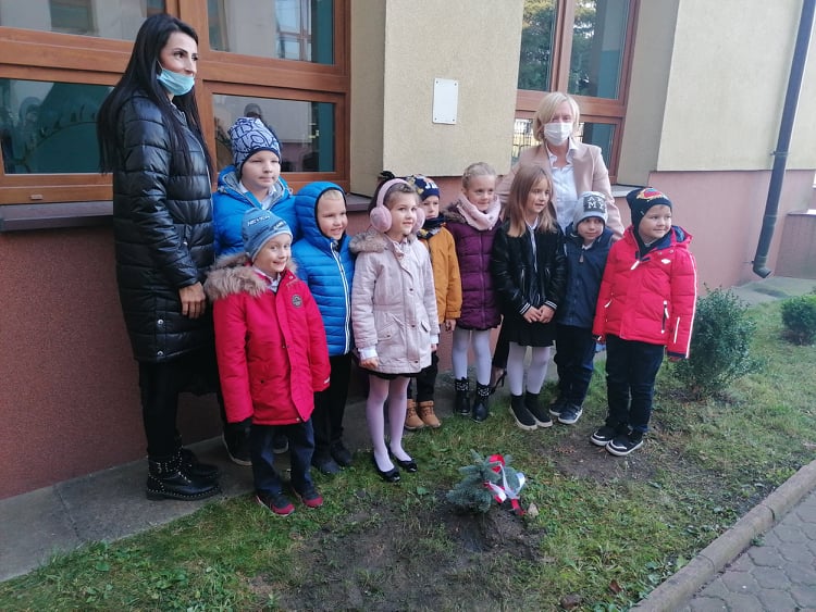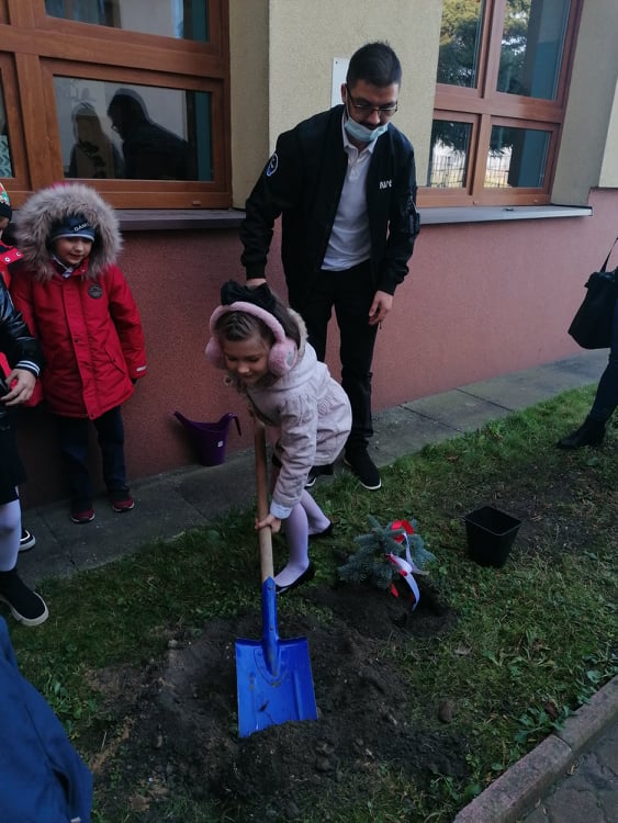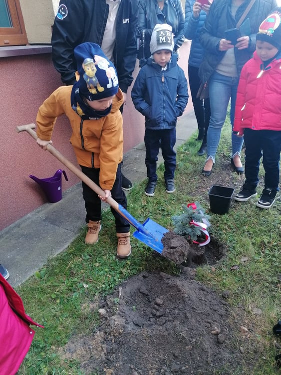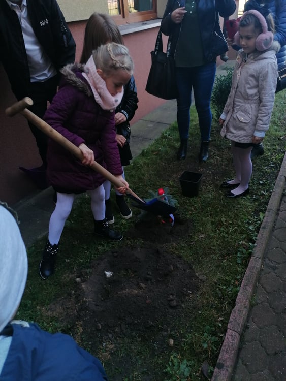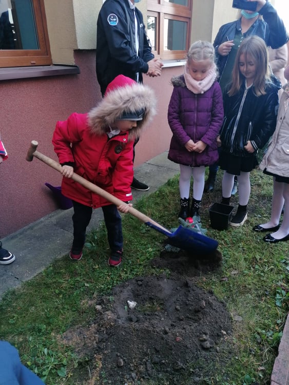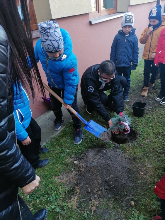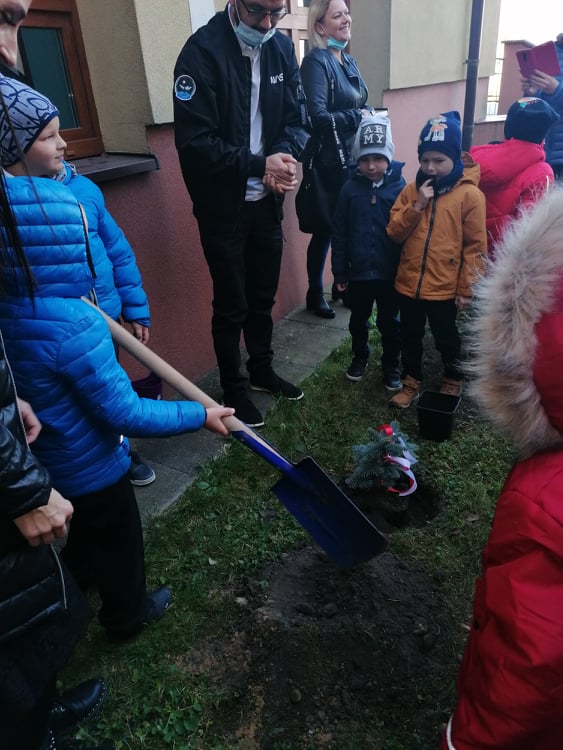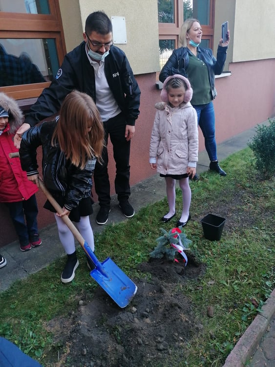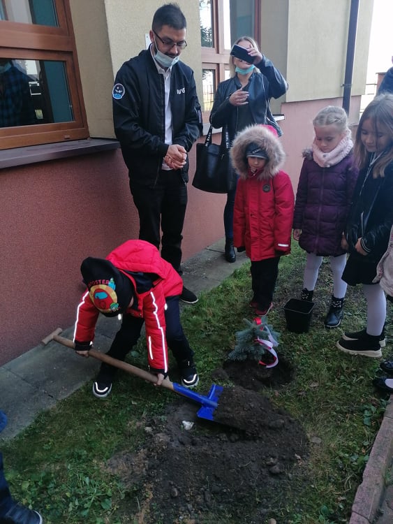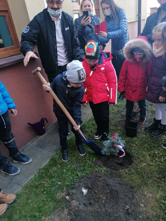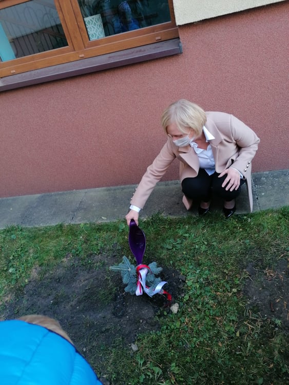 Zgodnie z tradycją naszej szkoły na zakończenie uroczystości uczniowie z rodzicami i gośćmi posadzili pamiątkowe drzewko przed budynkiem szkoły.