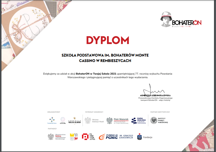 W tym roku nasza szkoła ponownie uczestniczyła w ogólnopolskiej kampanii o tematyce historycznej ,,BohaterON – włącz historię!'' Kampania ma na celu upamiętnienie i uhonorowanie uczestników Powstania Warszawskiego oraz kształtowanie postaw patriotycznych.