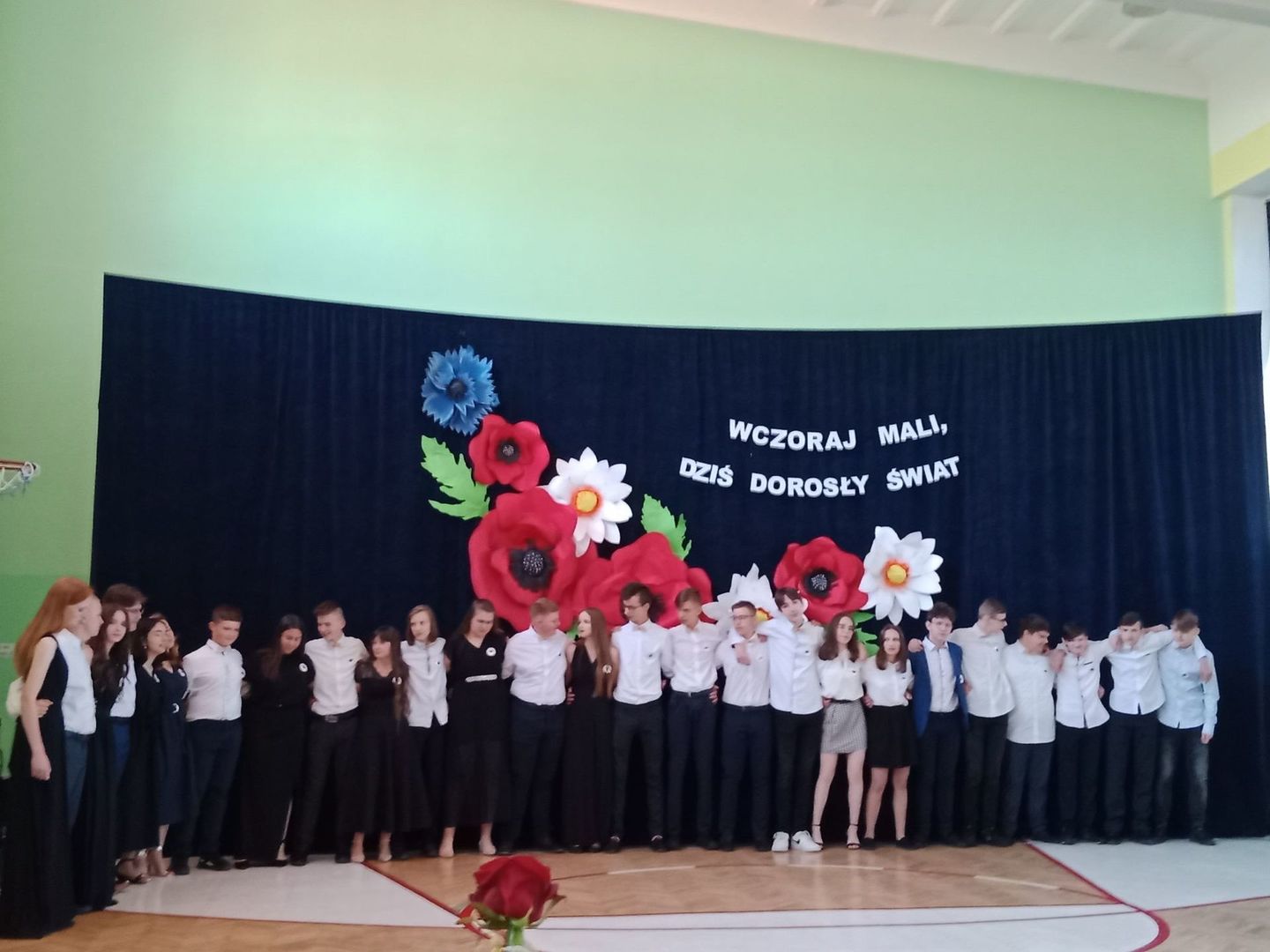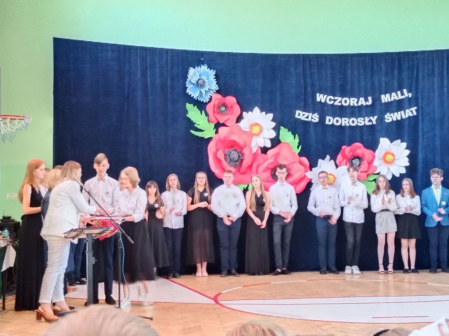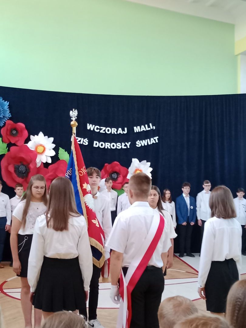 Czas nieubłaganie płynie, podróż ósmoklasistów pod kierunkiem wychowawczyni pani Benedykty Jopek w naszej szkole dobiegła końca, ale zanim się rozstaliśmy, jeszcze raz mogliśmy podziwiać ich rozliczne talenty muzyczno - wokalne. Piękny polonez, montaż słowno muzyczny ,,Wczoraj mali, dziś dorosły świat'', na długo pozostaną w naszej pamięci. Nie zabrakło słów podziękowań dla pani dyrektor Olgi Muszyńskiej, księdza proboszcza Zbigniewa Bienia, nauczycieli, pracowników szkoły, a także rodziców. Były życzenia i nagrody dla wyróżniających się uczniów, listy gratulacyjne dla rodziców.