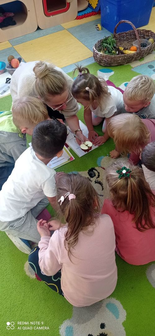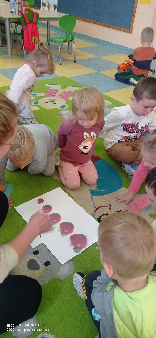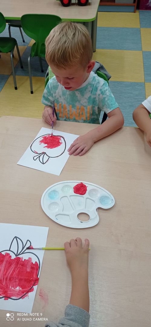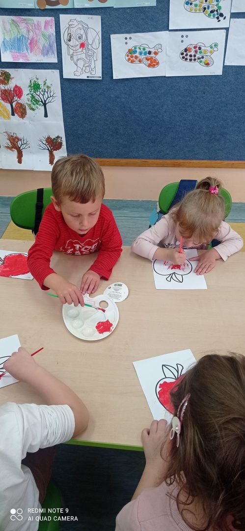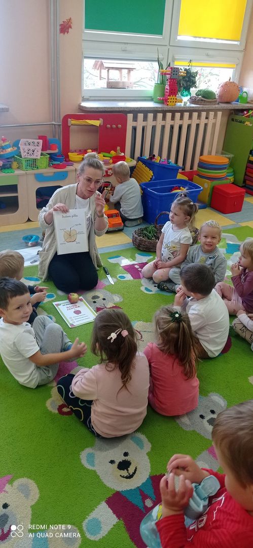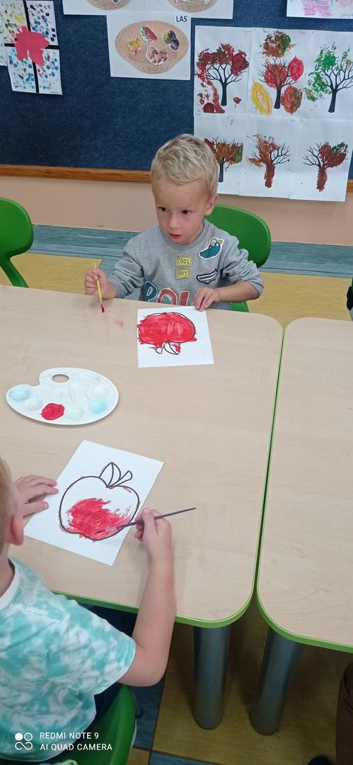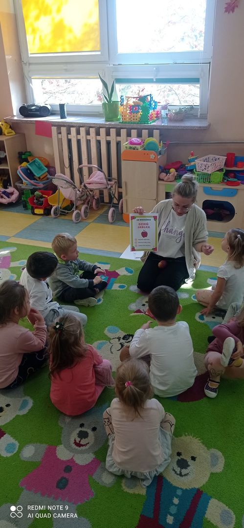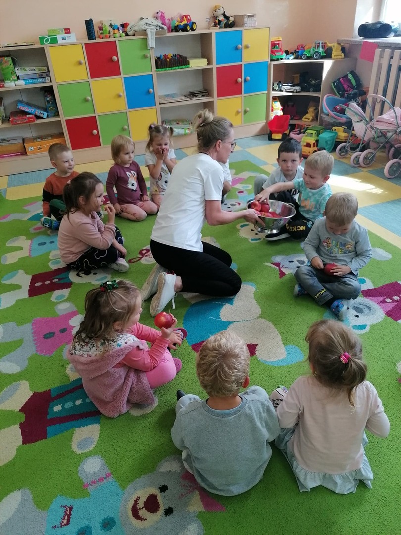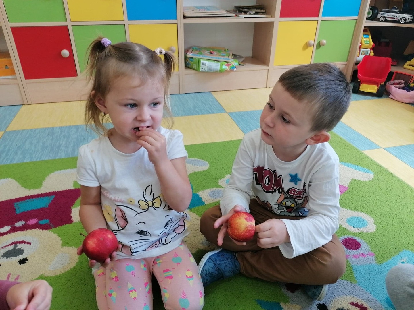 28 września w przedszkolaki przyłączyły się do obchodów Światowego Dnia Jabłka. Celem zajęć była promocja zdrowego stylu życia i odżywiania. Obchody Dnia Jabłka w przedszkolu rozpoczęliśmy od rozmów na temat jego wyglądu, kolorów, wielkości, kształtu, smaku, różnych odmian, dlaczego warto je jeść, pod jaką postacią i czy tylko ludzie lubią te owoce? Przedszkolaki dowiedziały się, że bardzo ważne jest to, żeby jabłka jeść ze skórką. Wszystkie zabawy tego dnia dominowały pod znakiem jabłka – były piosenki, tańce, a także zagadki i działania matematyczne. Dzieci świetnie poradziły sobie z przeliczaniem i porównywaniem jabłek. Podczas zabawy, miały także okazję opowiadania o jabłkach oraz wykonywania pracy plastycznej - malowanie farbami. Dzieci mogły także wykazać się w szybkim układaniu jabłkowych puzzli. Milusińscy na koniec pozowali do zdjęcia w jabłkowej „foto budce” oraz zajadali się pysznymi jabłuszkami.