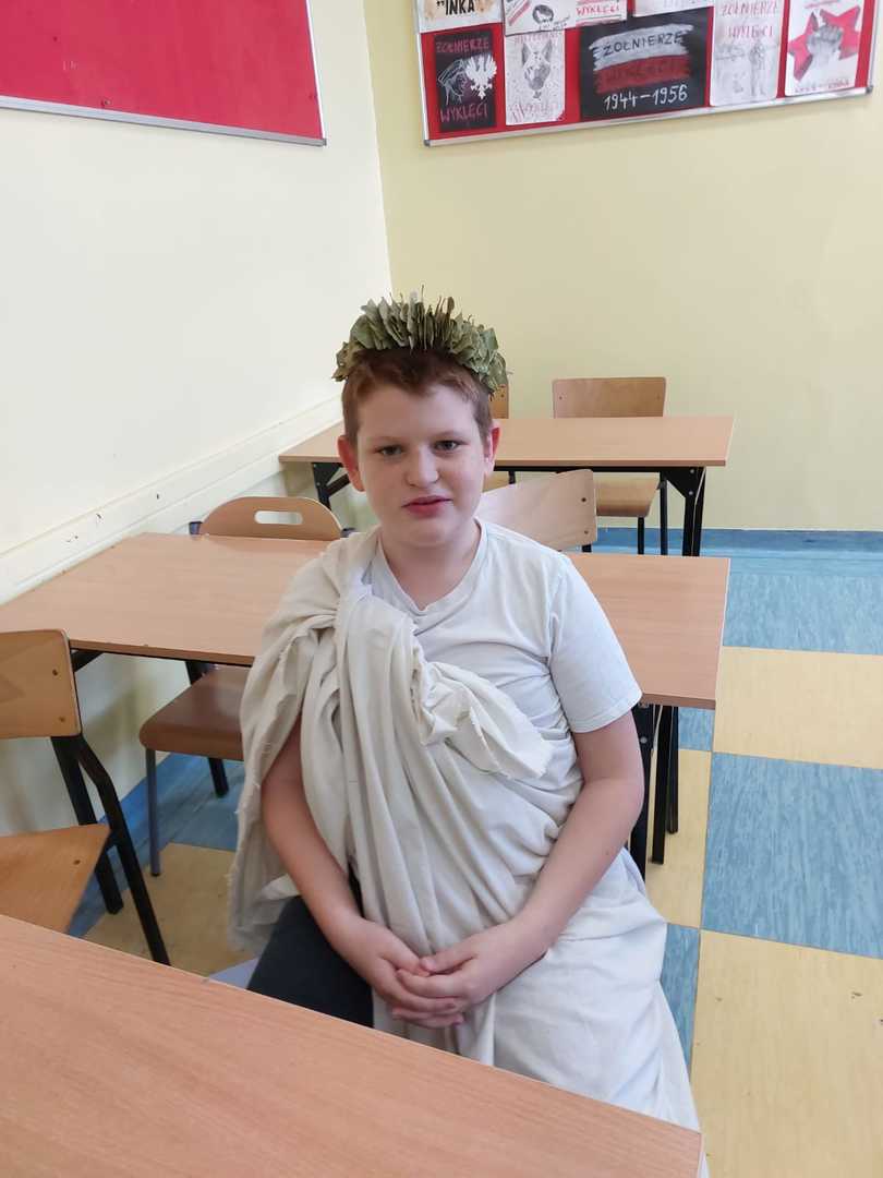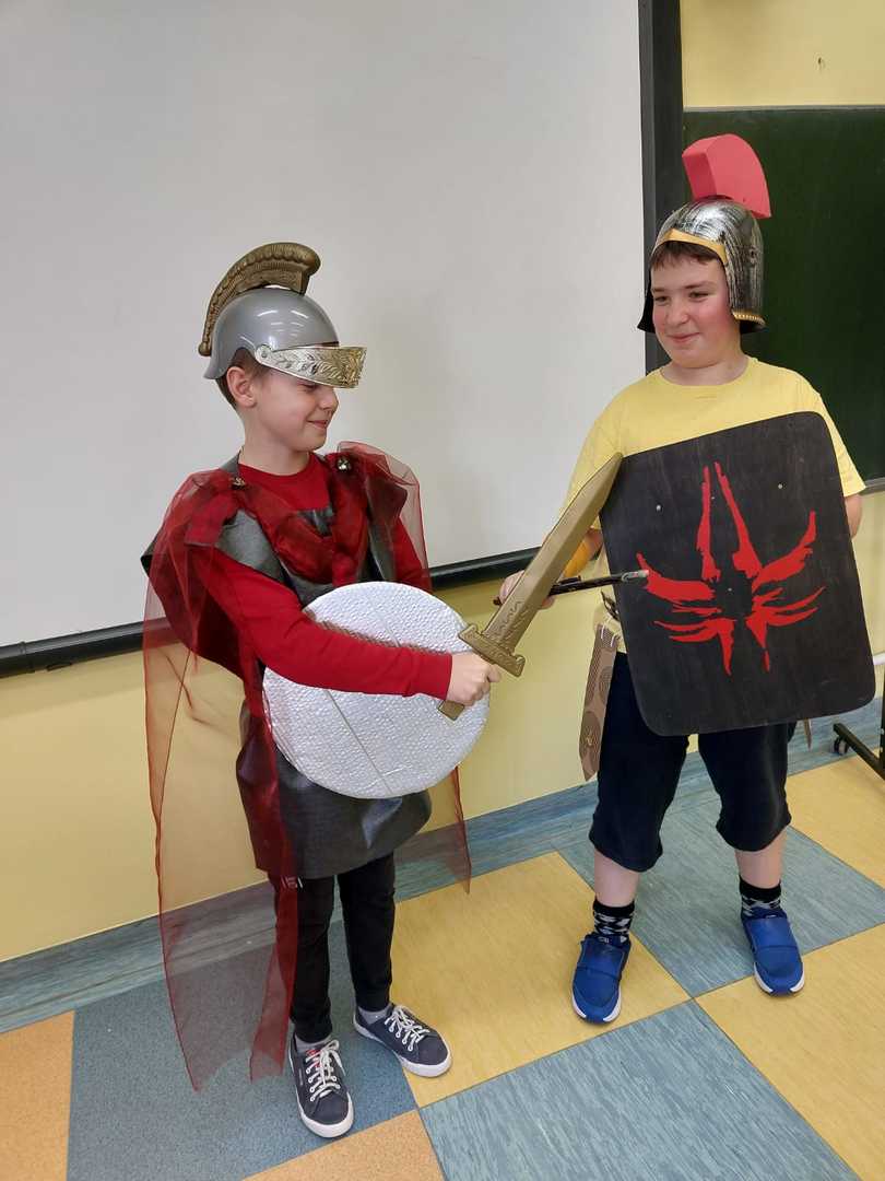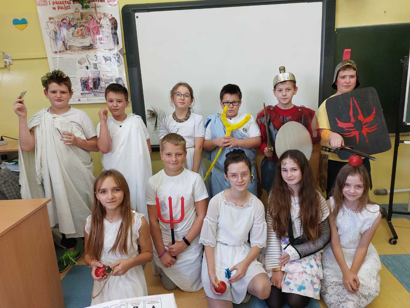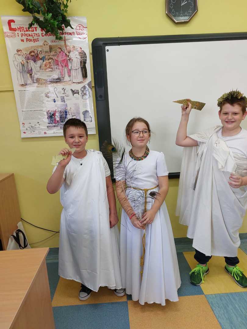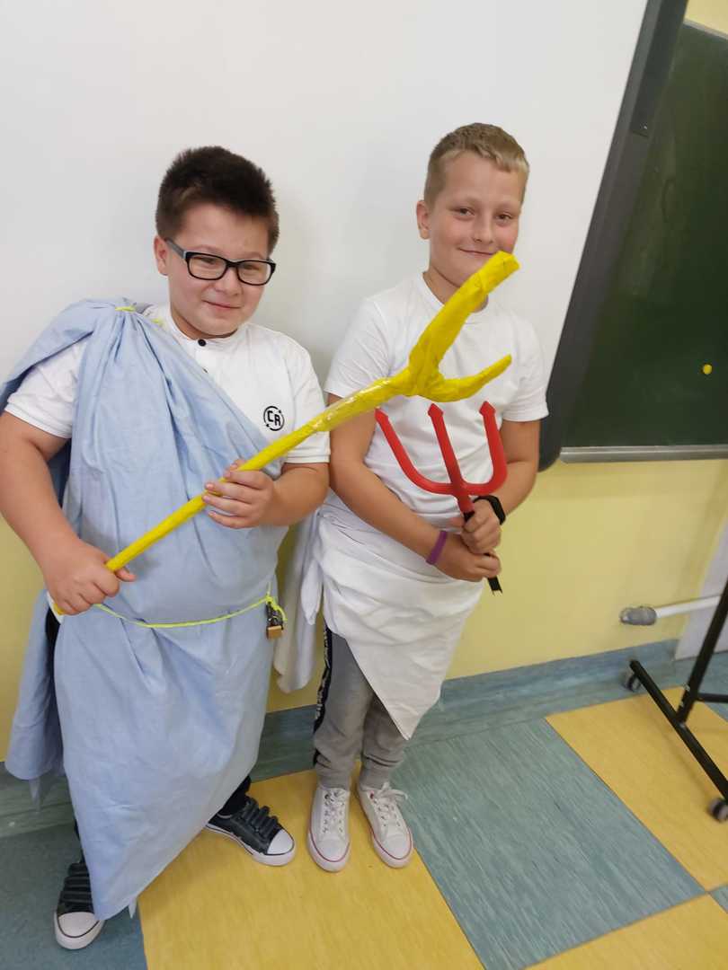 4 listopada odbyła się niecodzienna lekcja historii w klasie V. Uczniowie przenieśli nas w świat bogów greckich. Przygotowali stroje i boskie atrybuty. Z wizytą na Olimp do gromowładnego Zeusa przybyli Posejdon, Hades, Merkury, Afrodyta, Hera i Atena. Piątoklasiści nie tylko utrwalili wiadomości na temat wierzeń starożytnej Grecji, ale także wspaniale się bawili. Słowa uznania należą się również rodzicom, którzy wraz z dziećmi przygotowali stroje oraz rekwizyty.