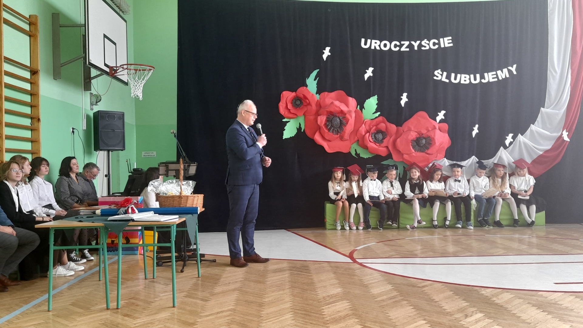 Na uroczystość przybył Burmistrz Miasta i Gminy Małogoszcz Pan Mariusz Piotrowski, dyrekcja szkoły, nauczyciele, rodzice uczniów klasy pierwszej oraz uczniowie wszystkich klas. Wydarzenie poprowadziły uczennice klasy VIII.