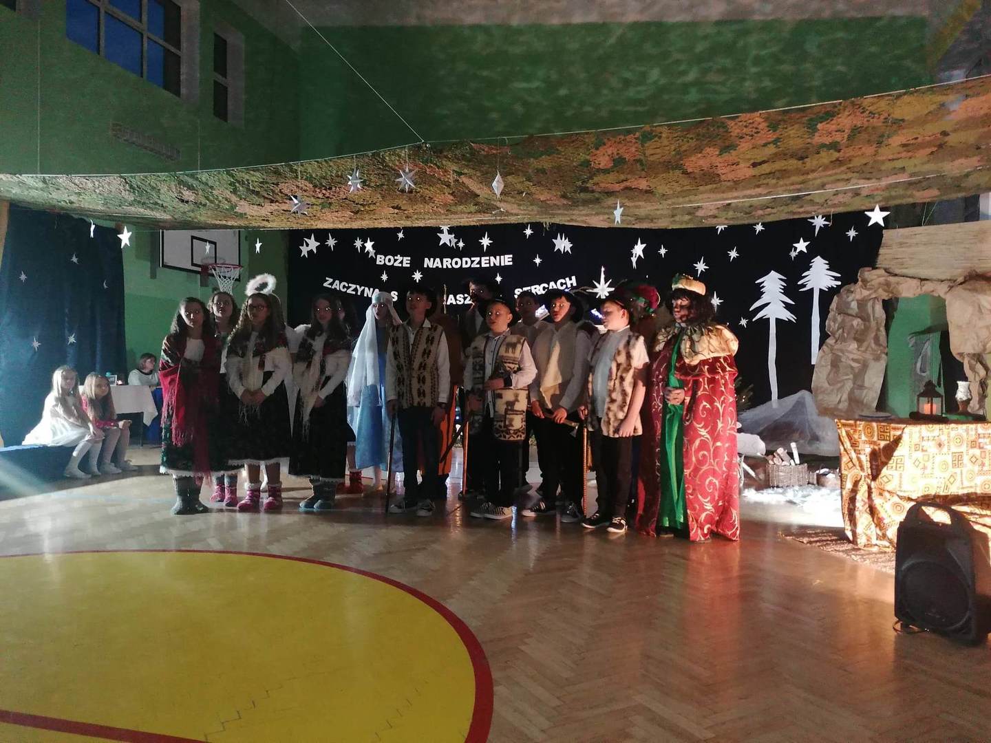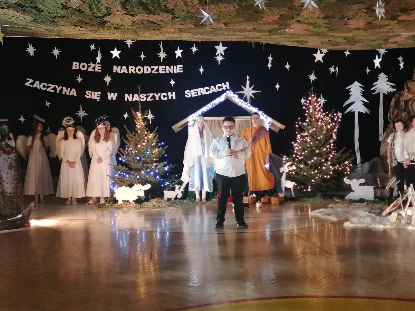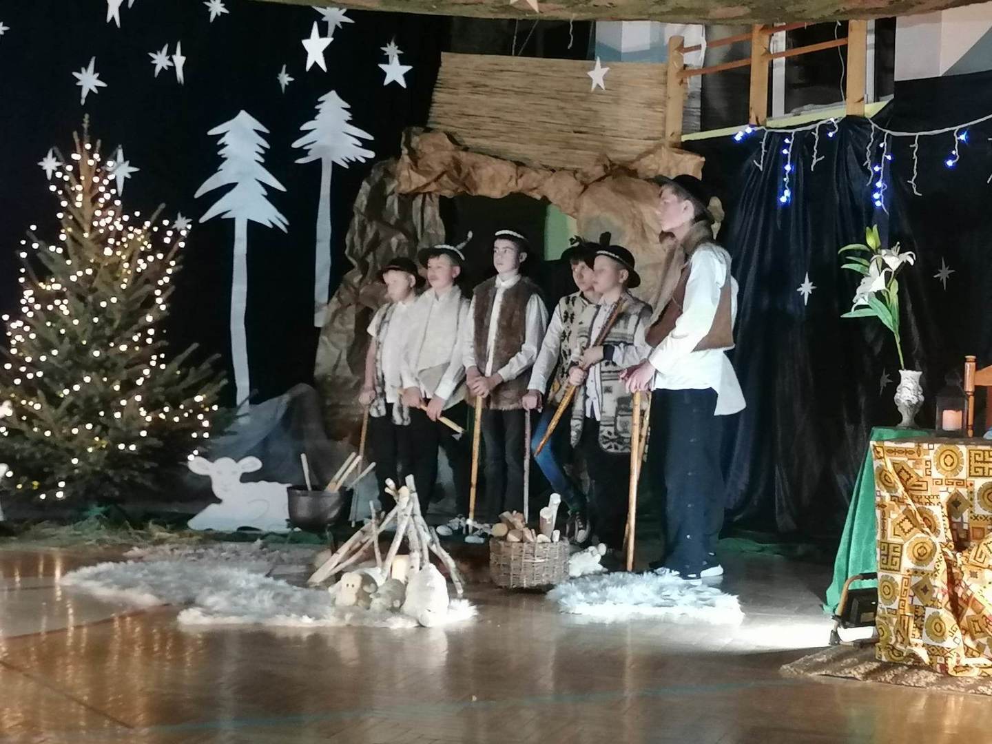 W tym wyjątkowym przedstawieniu, oprócz tradycyjnych, znanych kolęd, uczniowie zaśpiewali pastorałki „ Tylko jedna jest taka noc”, „Chojka”. Daniel Augustyn uczeń kl. V śpiewał pastorałkę „ Leć kolędo w świat”, a Zuzanna Szymkiewicz uczennica kl. VIII zagrała na flecie poprzecznym kolędę „ Wśród nocnej ciszy”. Całości przedstawienia uroku dodała przepiękna sceneria. Jasełka zakończyły się wspólnym kolędowaniem, a nasi aktorzy zostali nagrodzeni gromkimi brawami. Odebrali również gratulacje od Pana Burmistrza Mariusza Piotrowskiego oraz Pani Dyrektor Olgi Muszyńskiej.