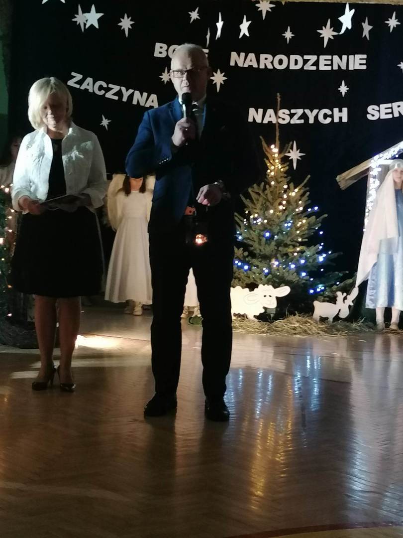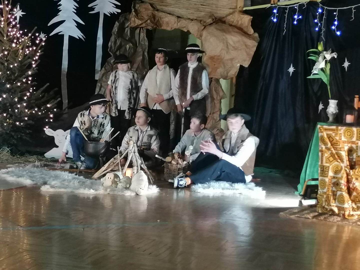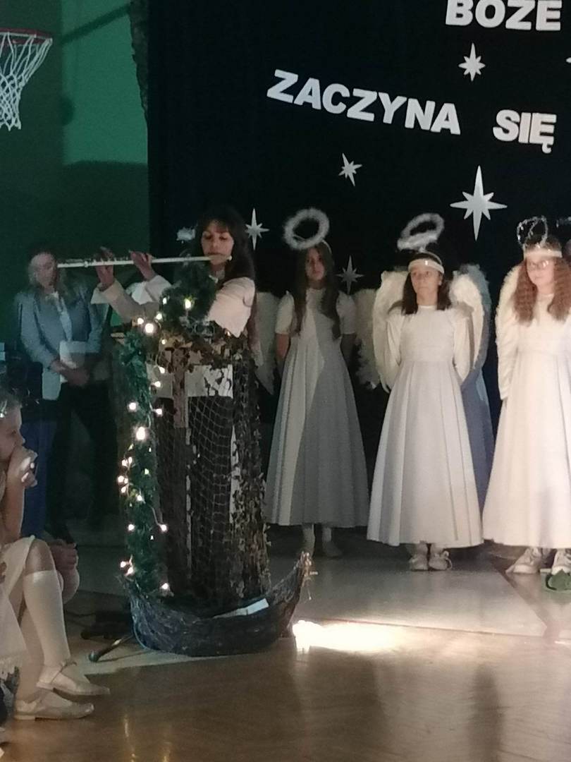 W tym wyjątkowym przedstawieniu, oprócz tradycyjnych, znanych kolęd, uczniowie zaśpiewali pastorałki „ Tylko jedna jest taka noc”, „Chojka”. Daniel Augustyn uczeń kl. V śpiewał pastorałkę „ Leć kolędo w świat”, a Zuzanna Szymkiewicz uczennica kl. VIII zagrała na flecie poprzecznym kolędę „ Wśród nocnej ciszy”. Całości przedstawienia uroku dodała przepiękna sceneria. Jasełka zakończyły się wspólnym kolędowaniem, a nasi aktorzy zostali nagrodzeni gromkimi brawami. Odebrali również gratulacje od Pana Burmistrza Mariusza Piotrowskiego oraz Pani Dyrektor Olgi Muszyńskiej.