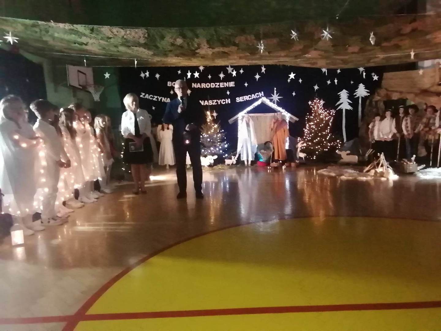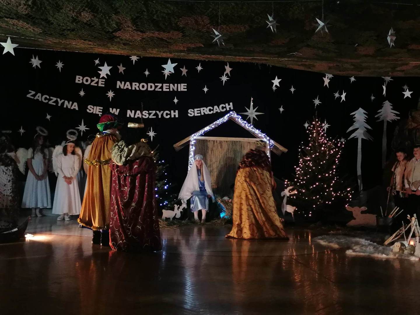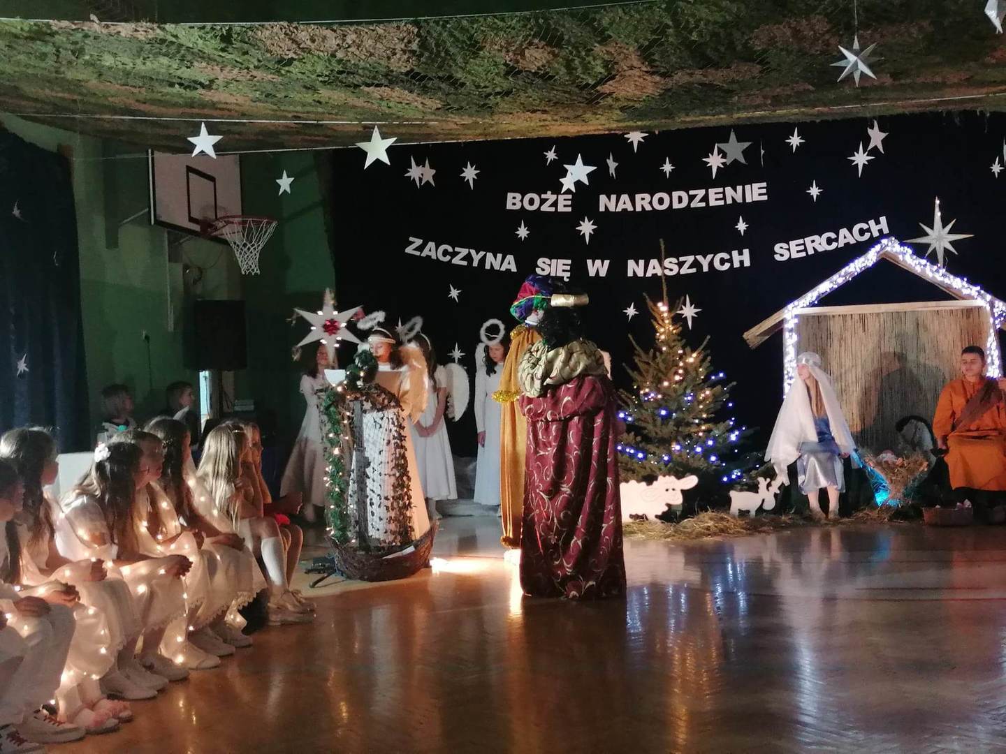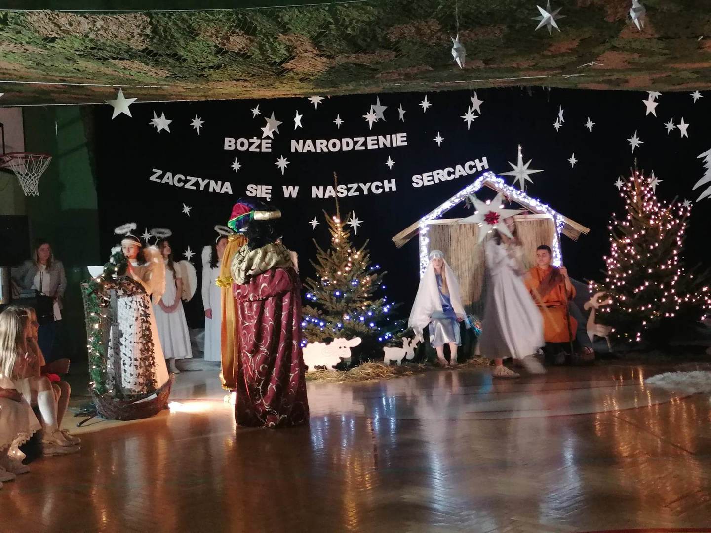 Przedstawienie rozpoczęło się wystąpieniem pani Dyrektor, która powitała przybyłych gości i zaprosiła na spektakl, który podzielony były na dwa akty. Pierwsza scena dotyczyła zwiastowania Najświętszej Maryi Panny. Druga przedstawiała narodzenie się Jezusa w stajence i składanie dzieciątku oraz jego rodzicom darów przez pasterzy ,trzech króli i dzieci. Uczniowie klasy III przedstawili układ taneczny do kolędy „ Mario, czy ty wiesz”.