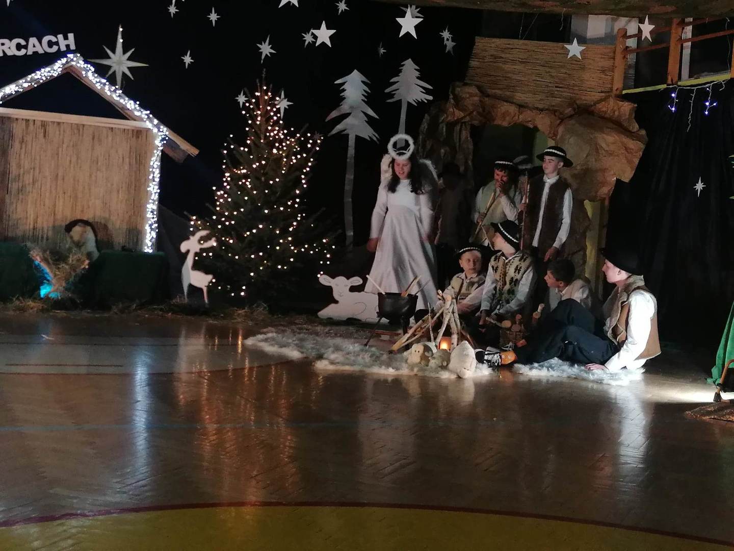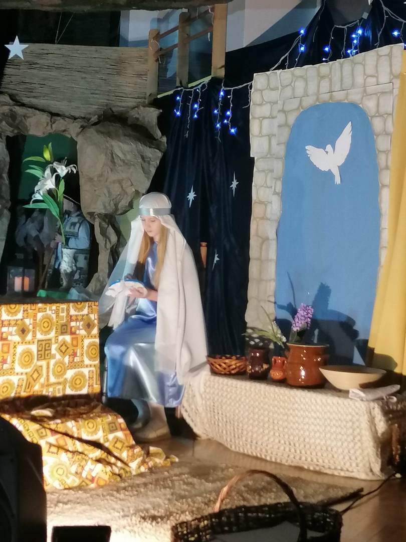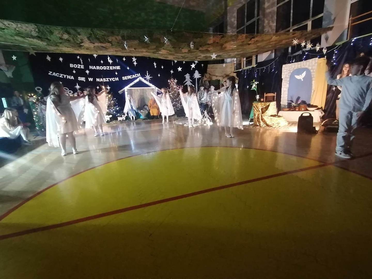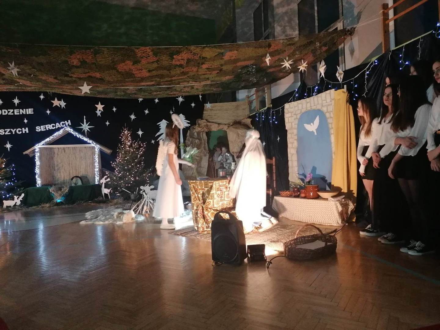 Przedstawienie rozpoczęło się wystąpieniem pani Dyrektor, która powitała przybyłych gości i zaprosiła na spektakl, który podzielony były na dwa akty. Pierwsza scena dotyczyła zwiastowania Najświętszej Maryi Panny. Druga przedstawiała narodzenie się Jezusa w stajence i składanie dzieciątku oraz jego rodzicom darów przez pasterzy ,trzech króli i dzieci. Uczniowie klasy III przedstawili układ taneczny do kolędy „ Mario, czy ty wiesz”.