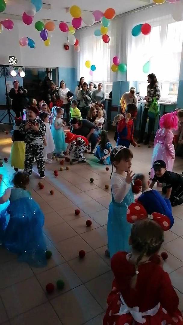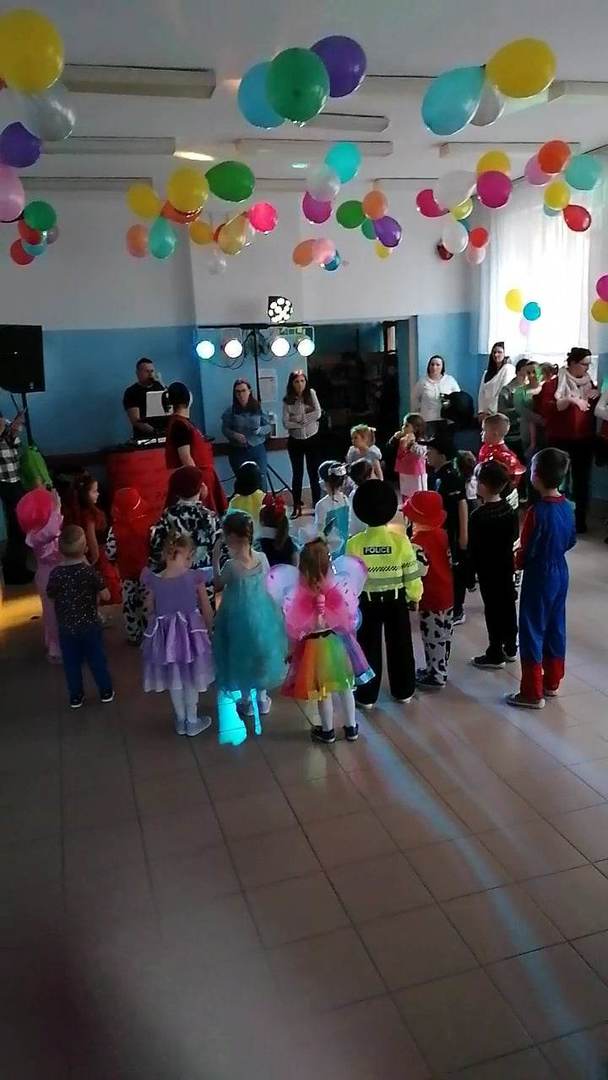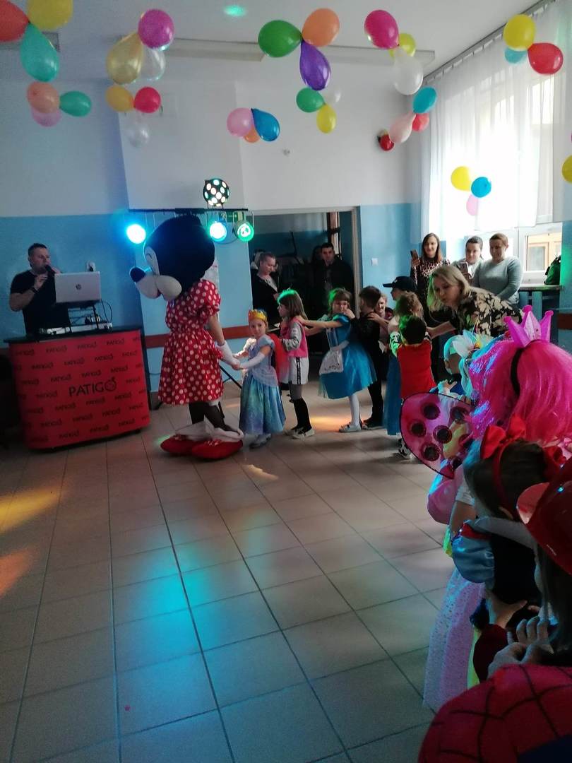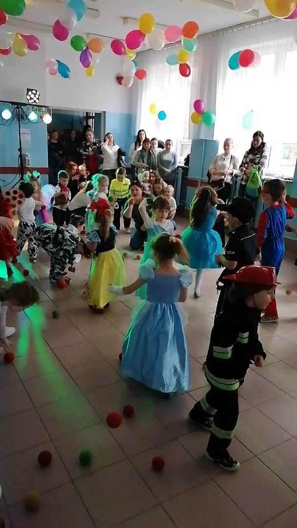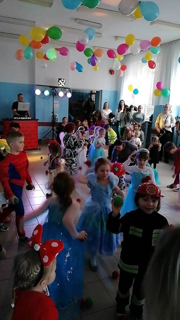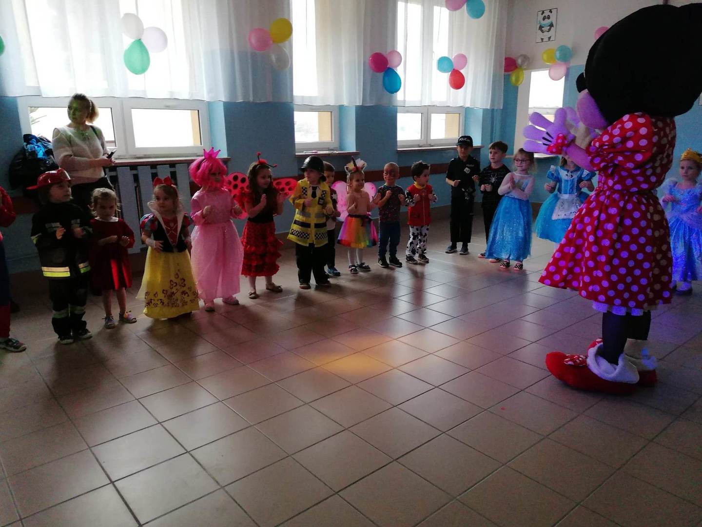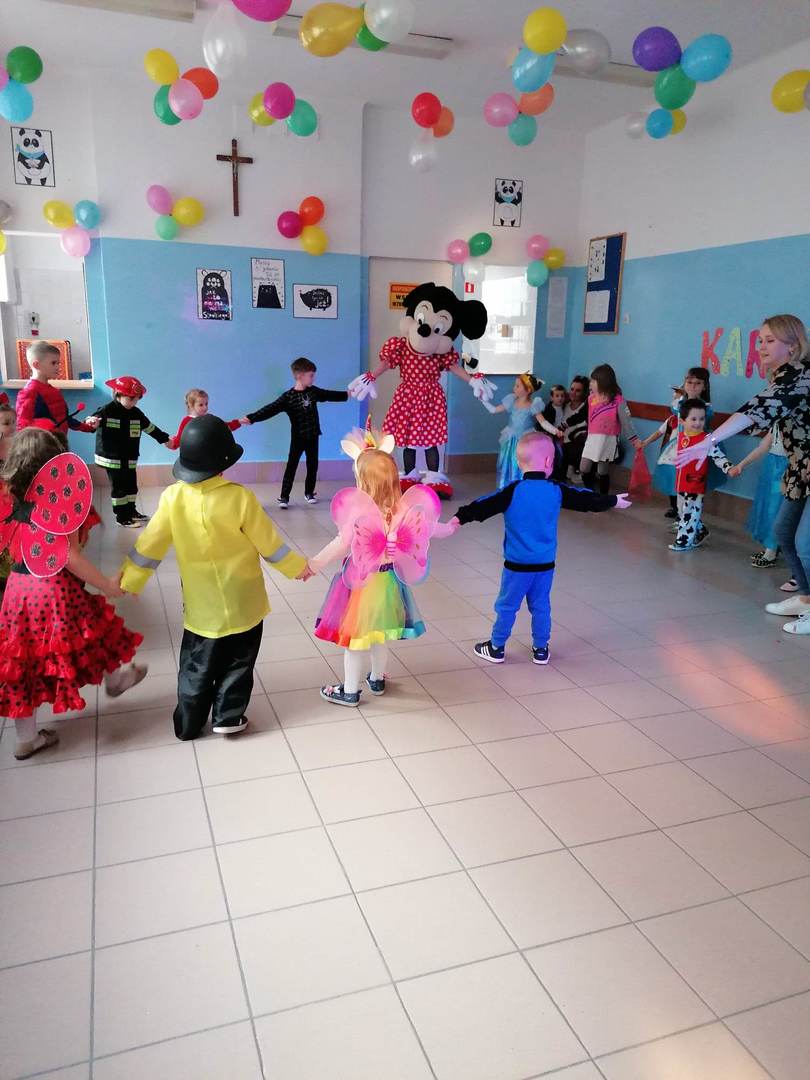 Tegoroczna zabawa karnawałowa w naszym przedszkoluodbyła się 15 lutego a zabawę prowadzili animatorzy z Agencji Artystycznej PATIGO z Kielc. Pojawienie się Myszki Mini wprowadziło dzieci w radosny nastrój, zachęcając do wspaniałej zabawy. Radości przedszkolaków nie było końca, świetnie bawiły się przy rytmach dziecięcych przebojów, chętnie uczestniczyły w konkursach, pląsach, grach sprawnościowych i zabawach muzyczno- ruchowych. Kolorowe pociągi, szalone pląsy przy muzyce wprawiły wszystkich w karnawałowy nastrój. Nikt nie mógł się nudzić i narzekać, a dzieci bawiły się wyśmienicie. Przedszkolaki przebrane były za bohaterów znanych bajek, można było spotkać: wróżki, biedronki, księżniczki, motylki, pszczółki, kotki, policjantów, Spider-Mana, Batmana... nie sposób zliczyć i wymienić tych wszystkich postaci