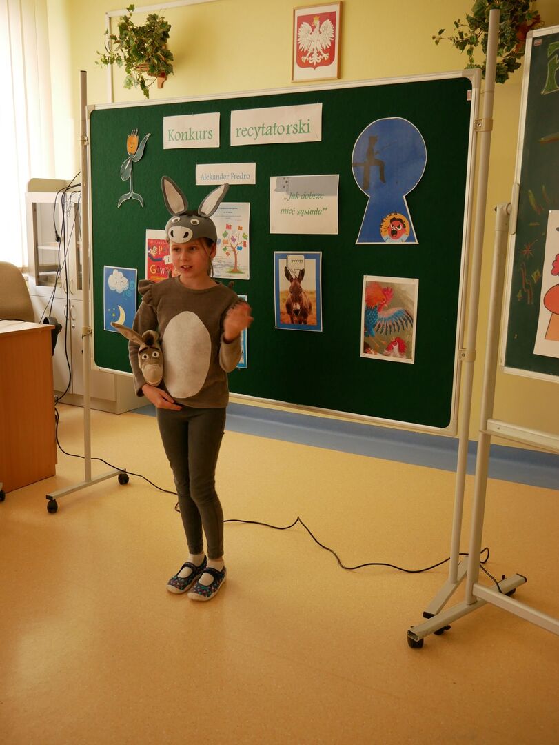 Celem konkursu było zainteresowanie dzieci twórczością Aleksandra Fredry, przybliżenie postaci pisarza, upowszechnienie kultury żywego słowa, zwrócenie uwagi na piękno słowa literackiego, w szczególności poezji z humorem a także integracja uczniów. Dzieci z klas I – IV deklamowały Pawła i Gawła, Koguty, Małpę w kąpieli, Bajeczkę o osiołku, Bajkę o sowie.