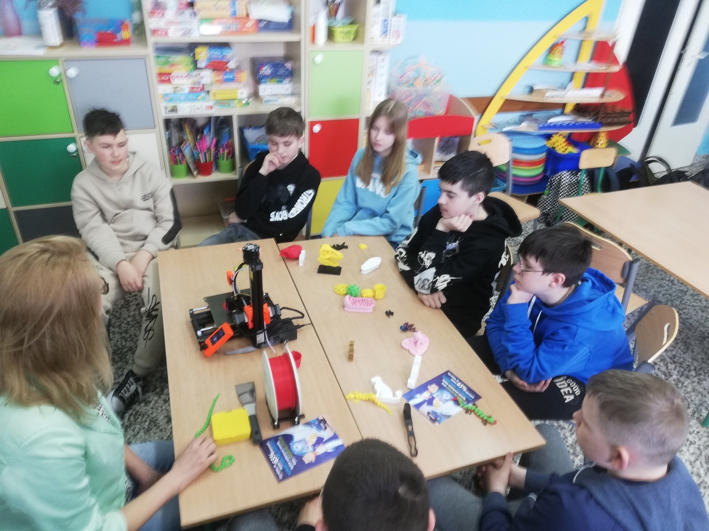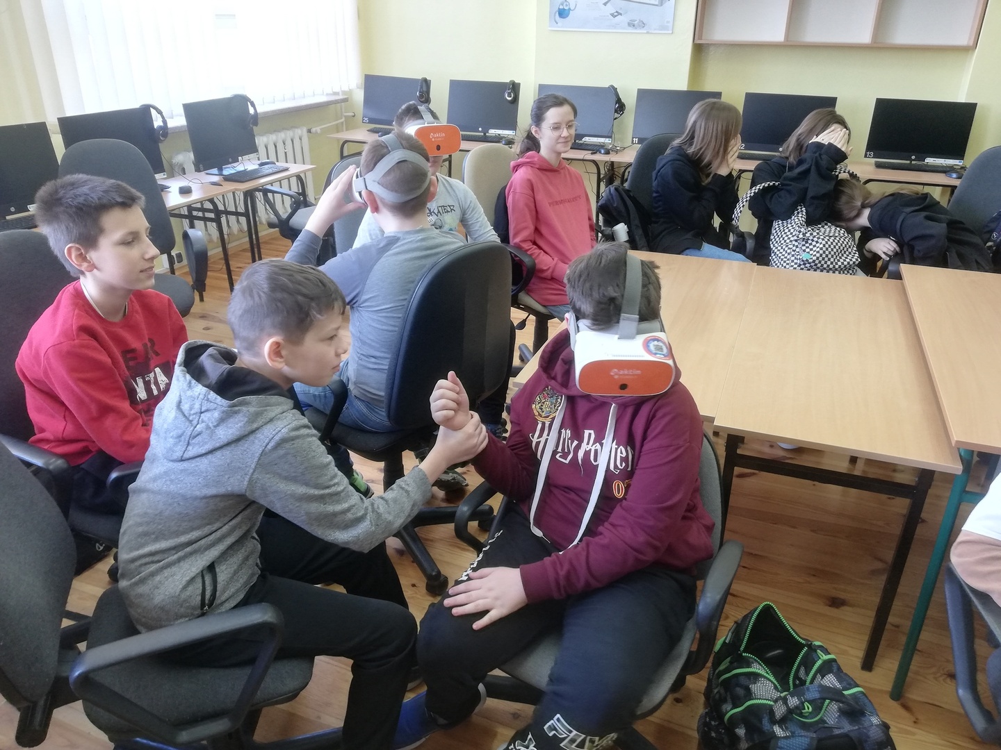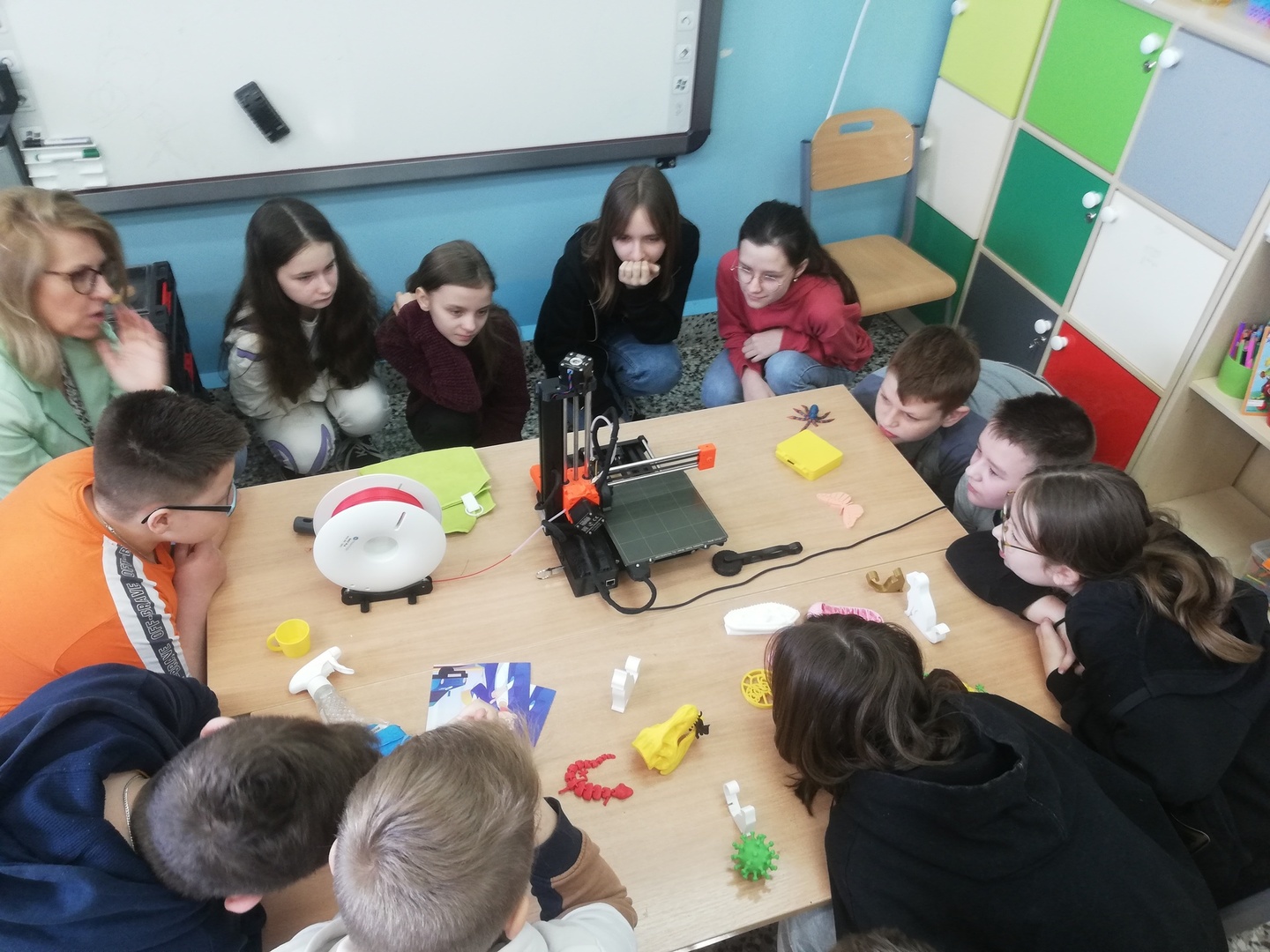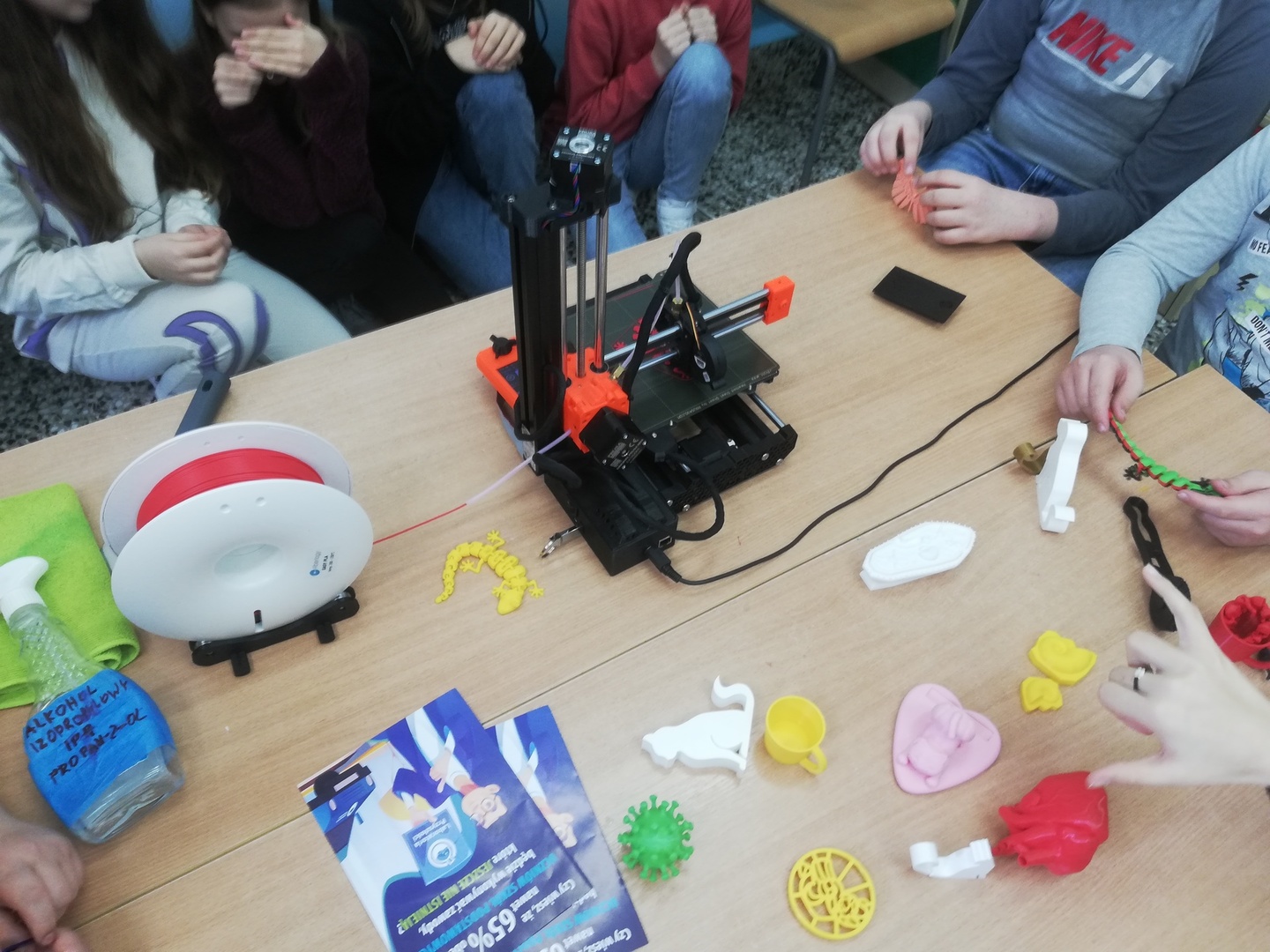 Przybyli edukatorzy przeprowadzili w formie warsztatowej zajęcia z wykorzystaniem nowych technologii czyli sprzętu, który szkoła otrzymała w ramach tego projektu. Podczas zajęć uczniowie zgłębiali tematykę druku 3D. Zapoznali się z budową drukarki, własnościami wydruków oraz wspólnie przygotowali projekt do wydruku. W czasie kolejnych warsztatów zapoznali się z pojęciem sztucznej inteligencji. Mieli też możliwość wzięcia udziału w zabawie rozpoznawania obrazów na przykładzie programu do rozpoznawania gestów. Poznali zasady użytkowania okularów VR.