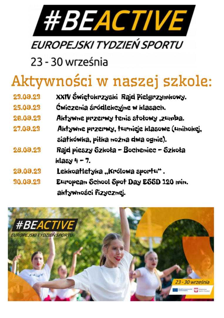 Europejski Tydzień Sportu jest inicjatywą Komisji Europejskiej mająca promować sport i aktywność fizyczną w całej Europie. Tydzień ten ma zapoczątkować nowe działania oraz opierać się na już istniejących, udanych przedsięwzięciach o charakterze europejskim, krajowym, regionalnym lub lokalnym. Ta ogólnoeuropejska kampania realizowana pod hasłem #BeActive ma zachęcić wszystkich do aktywnego trybu życia. Wspólnie ćwiczymy od 23 do 30 września.