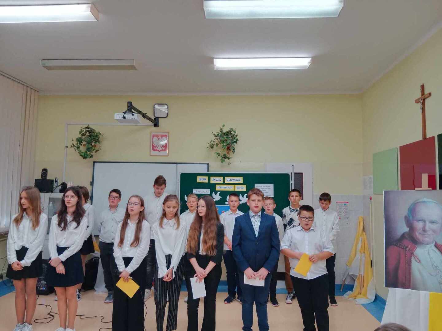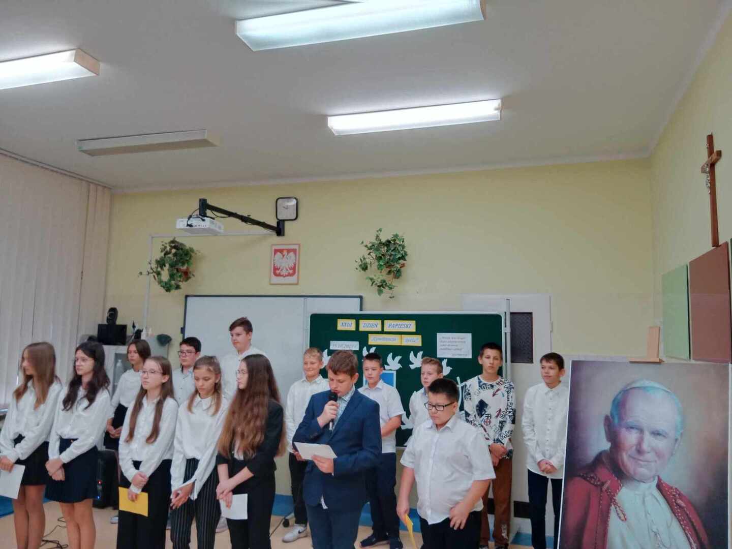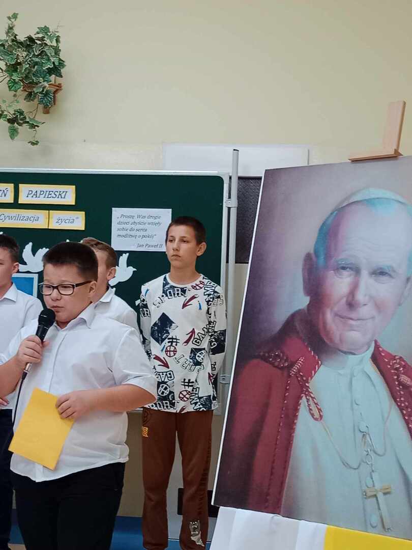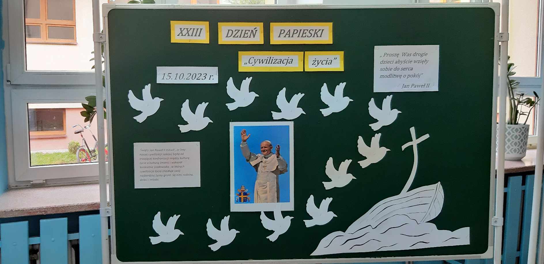 Dnia 15 października 2023r. w Polsce i w środowiskach polonijnych po raz XXIII obchodzony był Dzień Papieski, któremu towarzyszyło hasło „ Jan Paweł II. Cywilizacja życia”. Hasło to nawiązuje do encykliki św. Jana Pawła II z 1995r. pt. Evangelium vitae” ( Ewangelia życia) o wartości i nienaruszalności ludzkiego życia. 16 października w naszej szkole odbył się apel z okazji Dnia Papieskiego przygotowany przez uczniów klasy VI , w którym uczestniczyła cała społeczność szkolna. Wiersze, pieśni religijne, treści dotyczące papieża Polaka przypomniały wszystkim dzień wyboru Karola Wojtyły na papieża oraz jaką ważną był osobą dla naszego narodu. Swój wkład w przygotowanie do Dnia Papieskiego włożyły również klasy I- IV których uczniowie przygotowali kartki dla Jana Pawła II. Wystawę pięknych prac plastycznych mogliśmy oglądać w holu szkoły. Z kolei uczniowie klas V- VII przygotowali cytaty św. Jana Pawła II. Wszystko to przyczyniło się do upamiętnienia naszego rodaka , papieża Jana Pawła II.