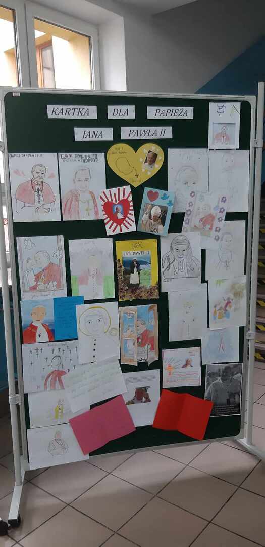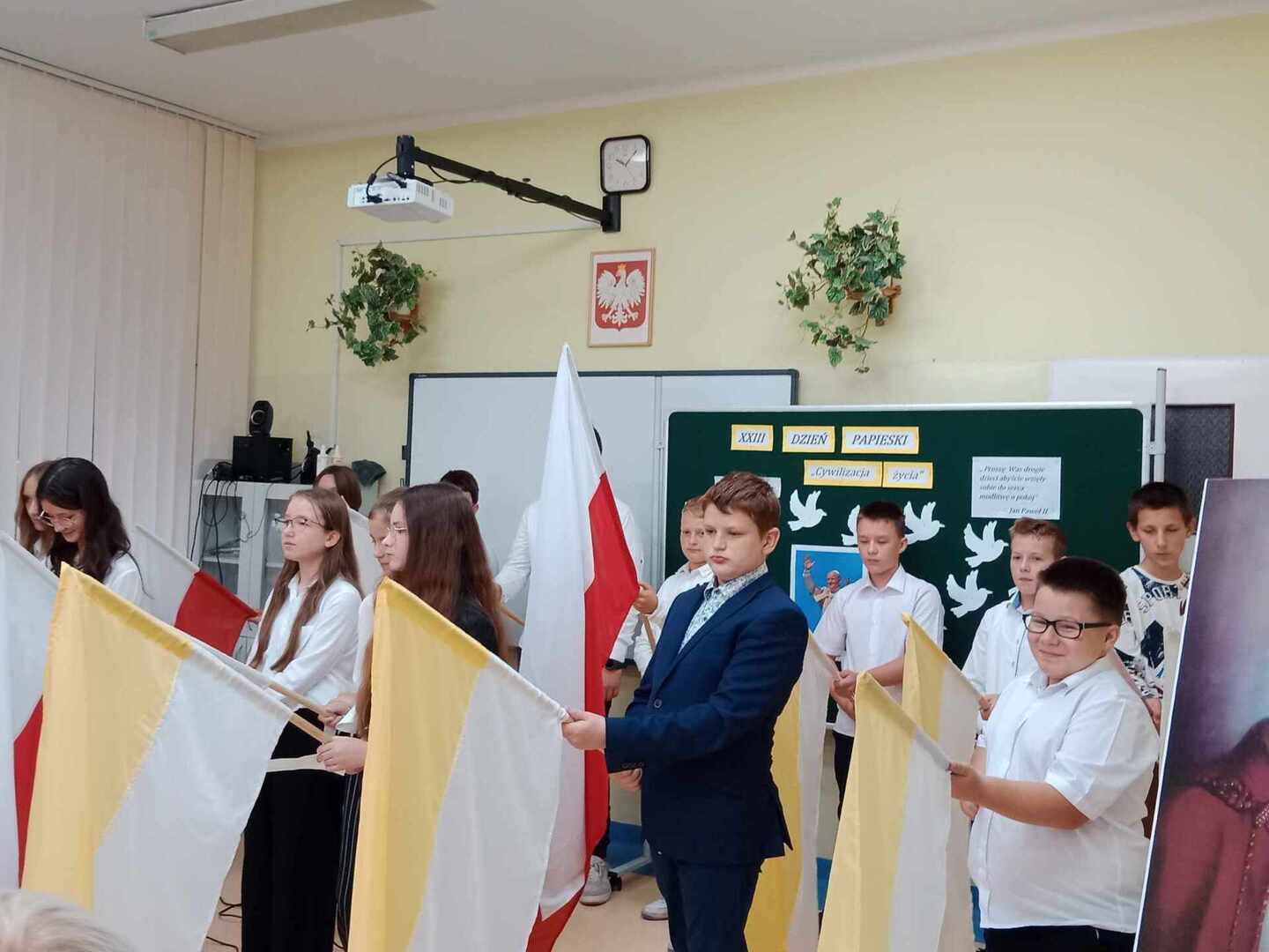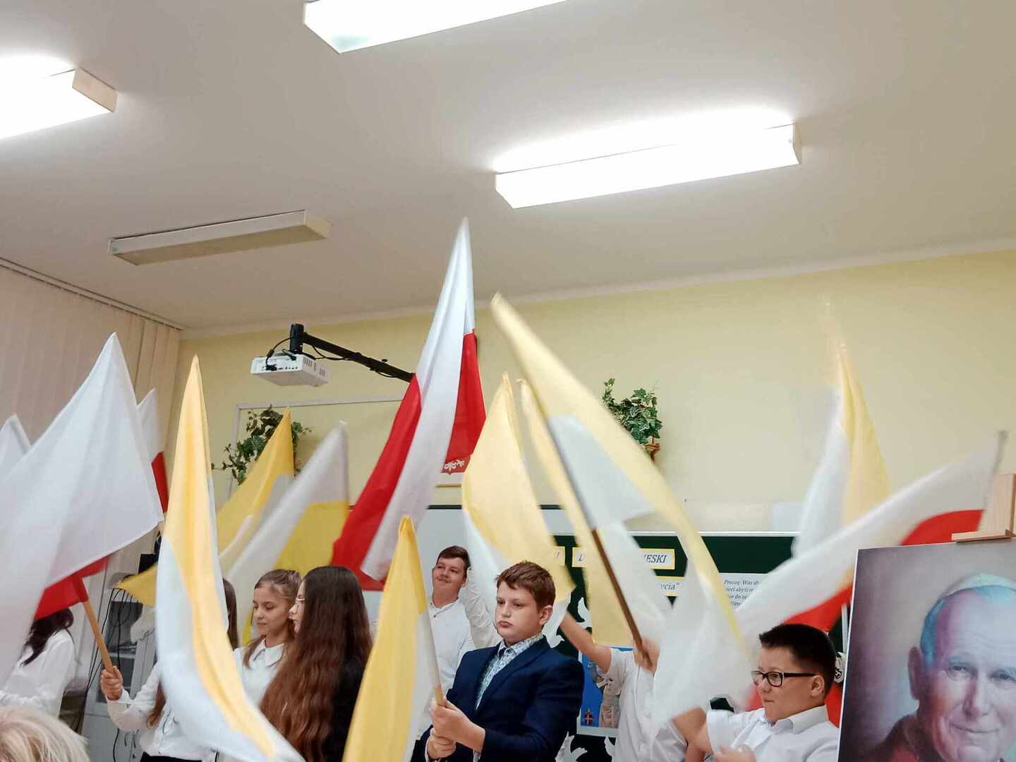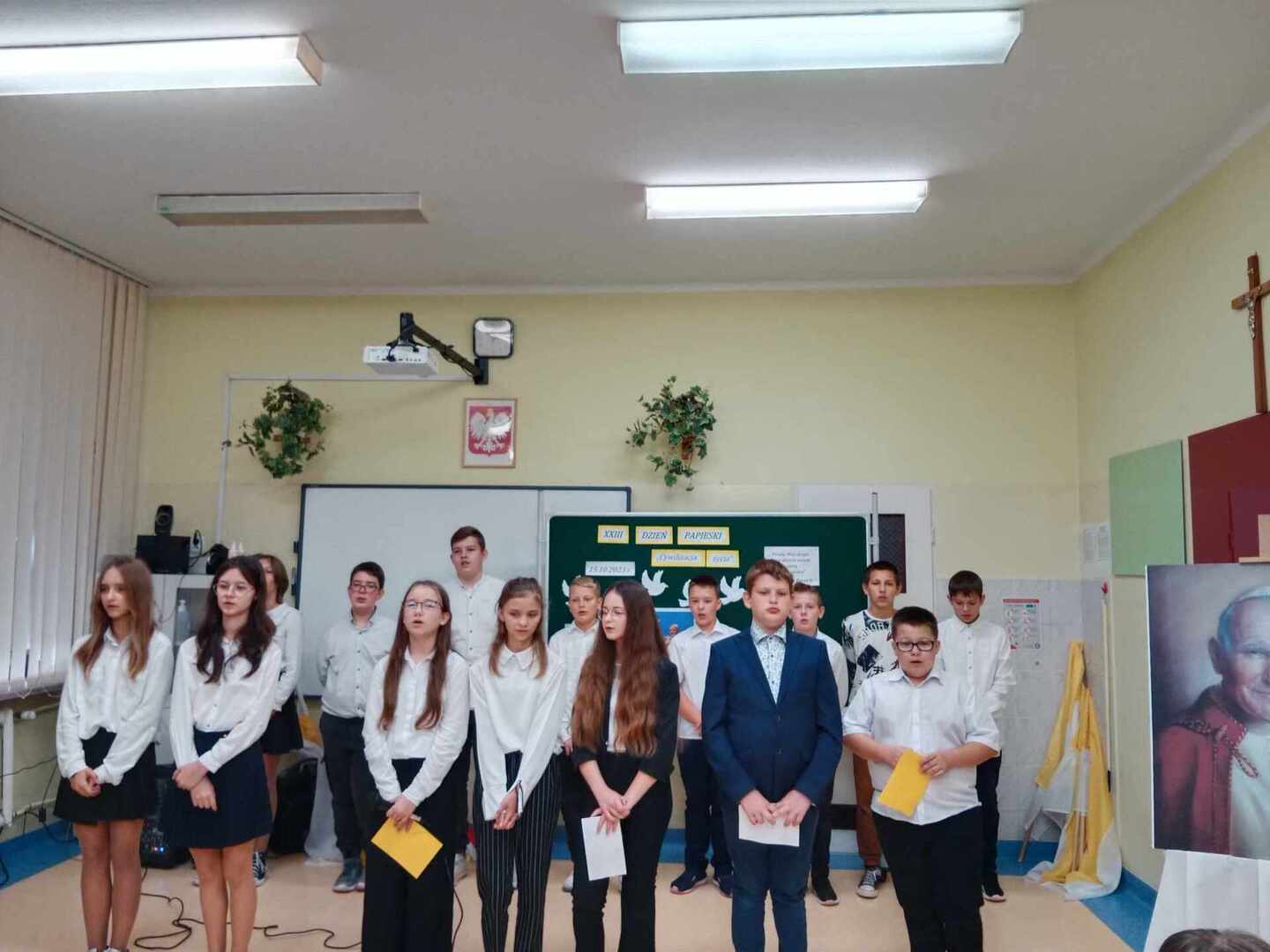Dnia 15 października 2023r. w Polsce i w środowiskach polonijnych po raz XXIII obchodzony był Dzień Papieski, któremu towarzyszyło hasło „ Jan Paweł II. Cywilizacja życia”. Hasło to nawiązuje do encykliki św. Jana Pawła II z 1995r. pt. Evangelium vitae” ( Ewangelia życia) o wartości i nienaruszalności ludzkiego życia. 16 października w naszej szkole odbył się apel z okazji Dnia Papieskiego przygotowany przez uczniów klasy VI , w którym uczestniczyła cała społeczność szkolna. Wiersze, pieśni religijne, treści dotyczące papieża Polaka przypomniały wszystkim dzień wyboru Karola Wojtyły na papieża oraz jaką ważną był osobą dla naszego narodu. Swój wkład w przygotowanie do Dnia Papieskiego włożyły również klasy I- IV których uczniowie przygotowali kartki dla Jana Pawła II. Wystawę pięknych prac plastycznych mogliśmy oglądać w holu szkoły. Z kolei uczniowie klas V- VII przygotowali cytaty św. Jana Pawła II. Wszystko to przyczyniło się do upamiętnienia naszego rodaka , papieża Jana Pawła II.