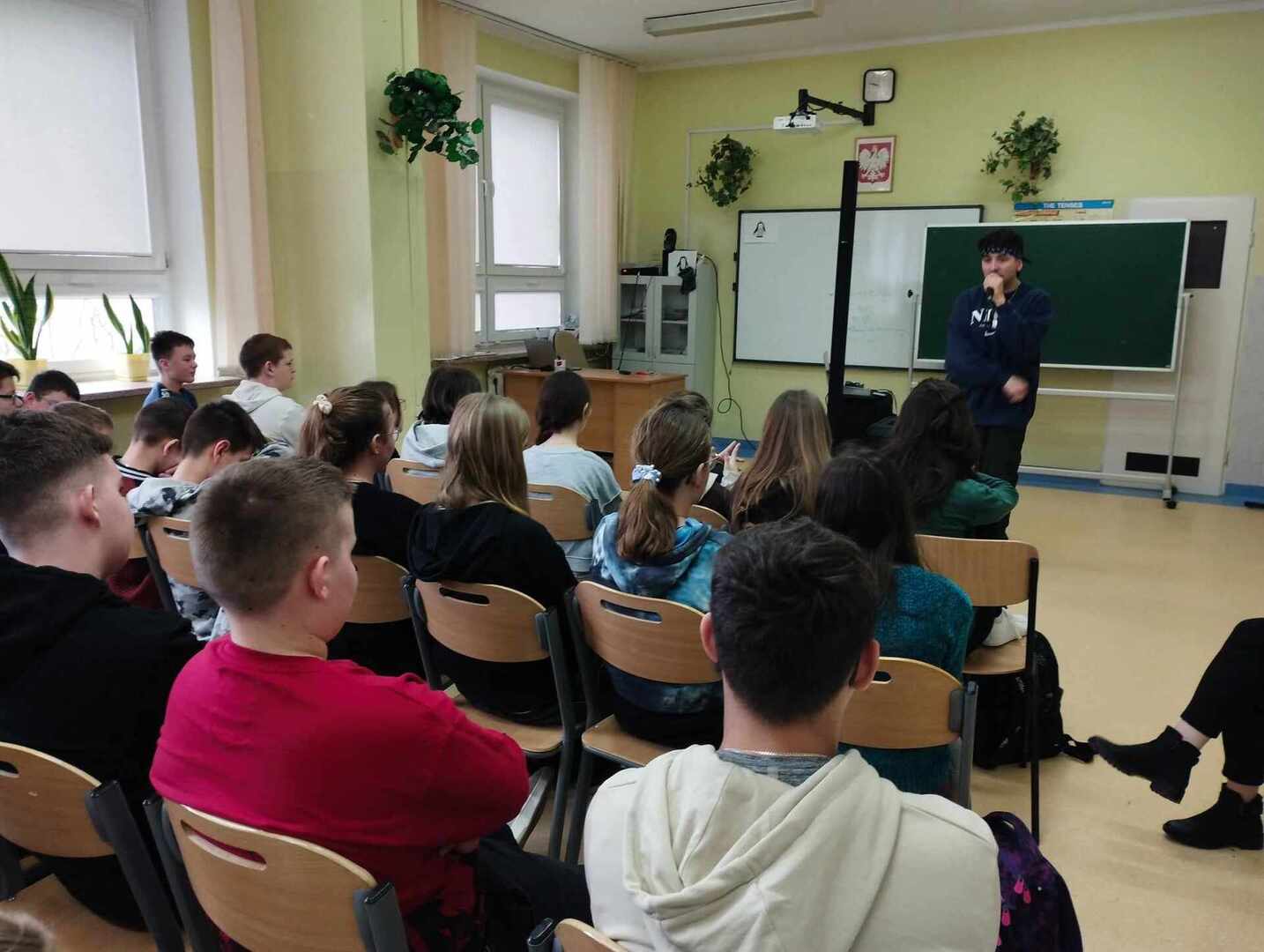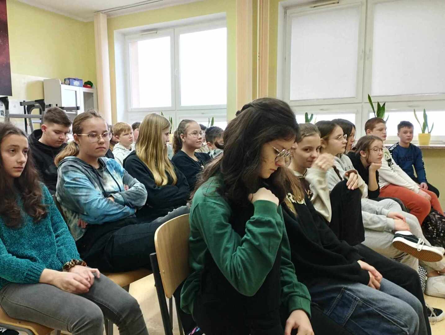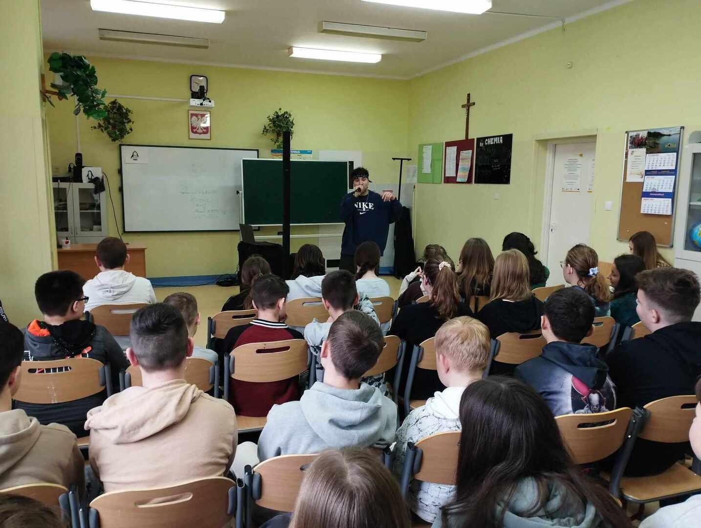 W dniu 29.02.2024r w naszej szkole odbył się Artystyczny Program Profilaktyki Uzależnień „Antymina”- autorstwa Mirosława Kolczyka „Kolah”. W spotkaniu wzięły udział klasy 6 – 7. Celem programu było przekazanie młodzieży wiedzy na temat zagrożeń, jakie niesie ze sobą uzależnienie od środków psychoaktywnych m.in. alkoholu, narkotyków i dopalaczy. Niezwykle trudne treści dotyczące uzależnień realizator przedstawił w sposób zrozumiały i bezpośredni. Osobiste świadectwo z życia prowadzącego, odwołanie się do wartości wyższych, wskazanie rodziny jako środowiska, które cierpi całościowo w przypadku uzależnienia choćby jednej osoby, nadawał uniwersalny przekaz treściom profilaktycznym. Wymowa programu kładła nacisk na osobistą odpowiedzialność za swoje życie i życiowe wybory. Program Antymina został oceniony przez uczniow jako niezwykle pouczający i wartościowy w swoim przekazie.