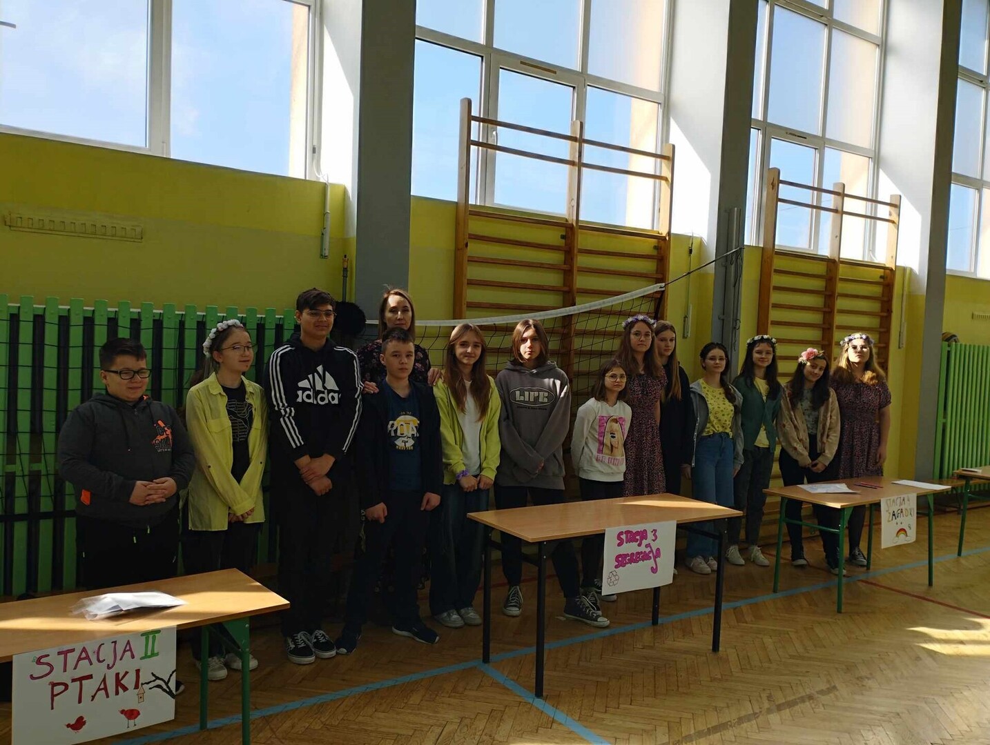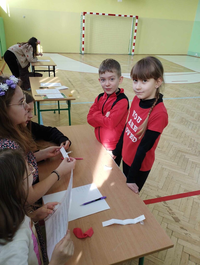 Z okazji Pierwszego Dnia Wiosny w klasach 1-3 została zorganizowana przez drużynę harcerską zabawa terenowa, podczas której uczniowie wykonywali zadania i utrwalali wiedzę. Harcerze przygotowali 6 stacji, na których przedstawiciele klas układali puzzle przedstawiające wiosenne kwiaty, rozpoznawali ptaki na podstawie ilustracji i rymowanek, segregowali śmieci, szukali Pani Wiosny, rozwiązywali zagadki oraz zapoznawali się z pojęciem "nowalijki" i odnajdywali ich nazwy w wykreślance. Na ostatniej stacji cała grupa podsumowała swoją wiedzę rozwiązując quiz. Na koniec gry wspólnie z wychowawcą uczniowie ułożyli wierszyk o wiośnie, który odczytali innym uczestnikom. Za udział i wspaniałą zabawę każda klasa otrzymała dyplom i brawa.