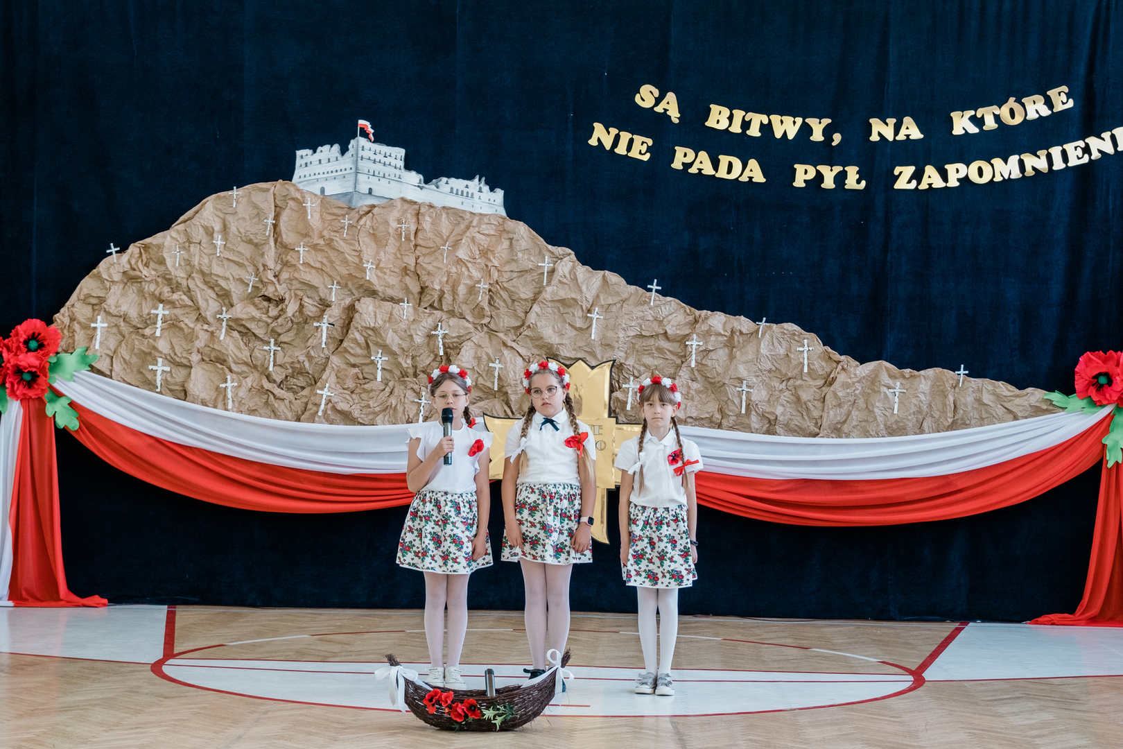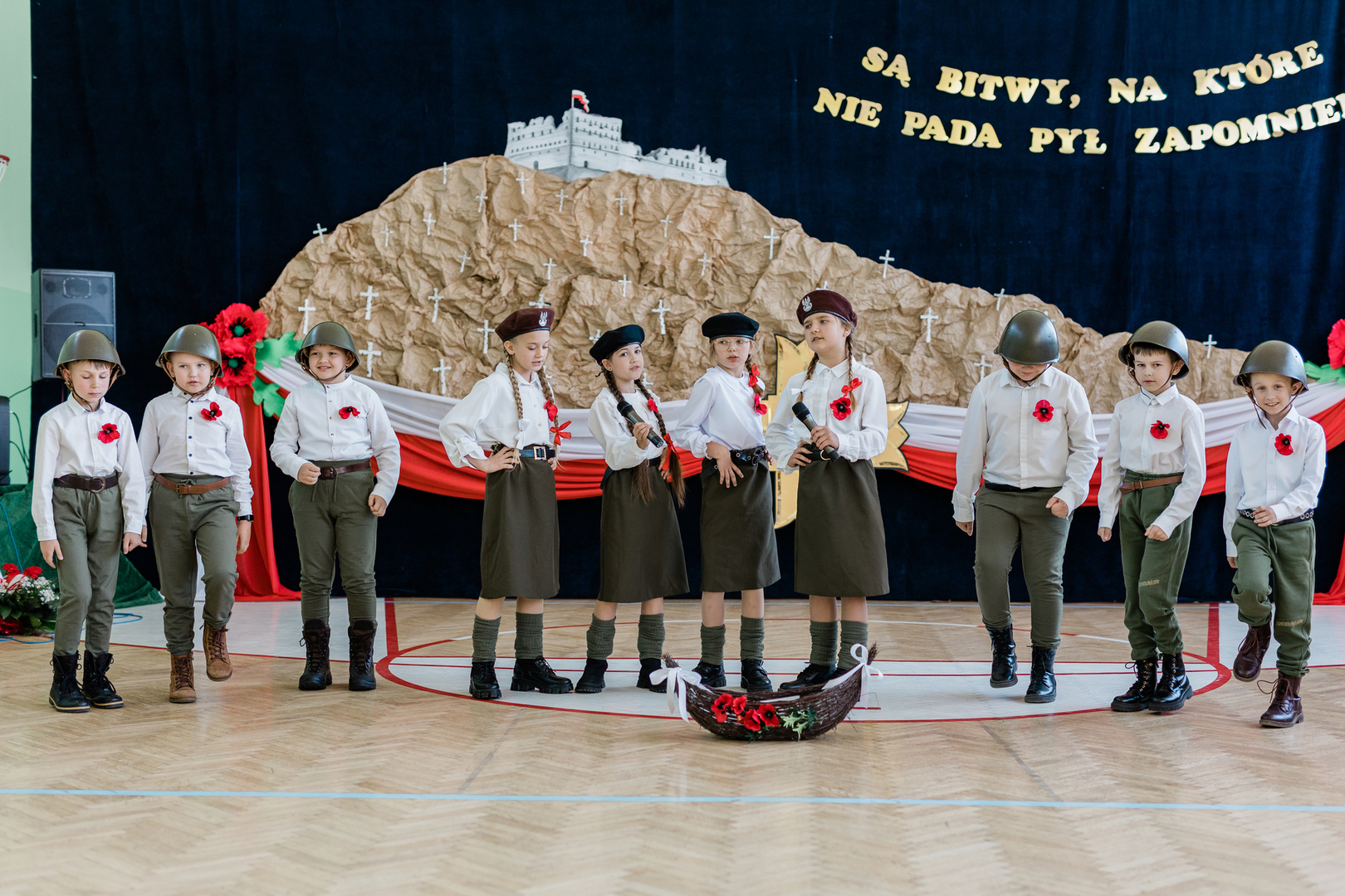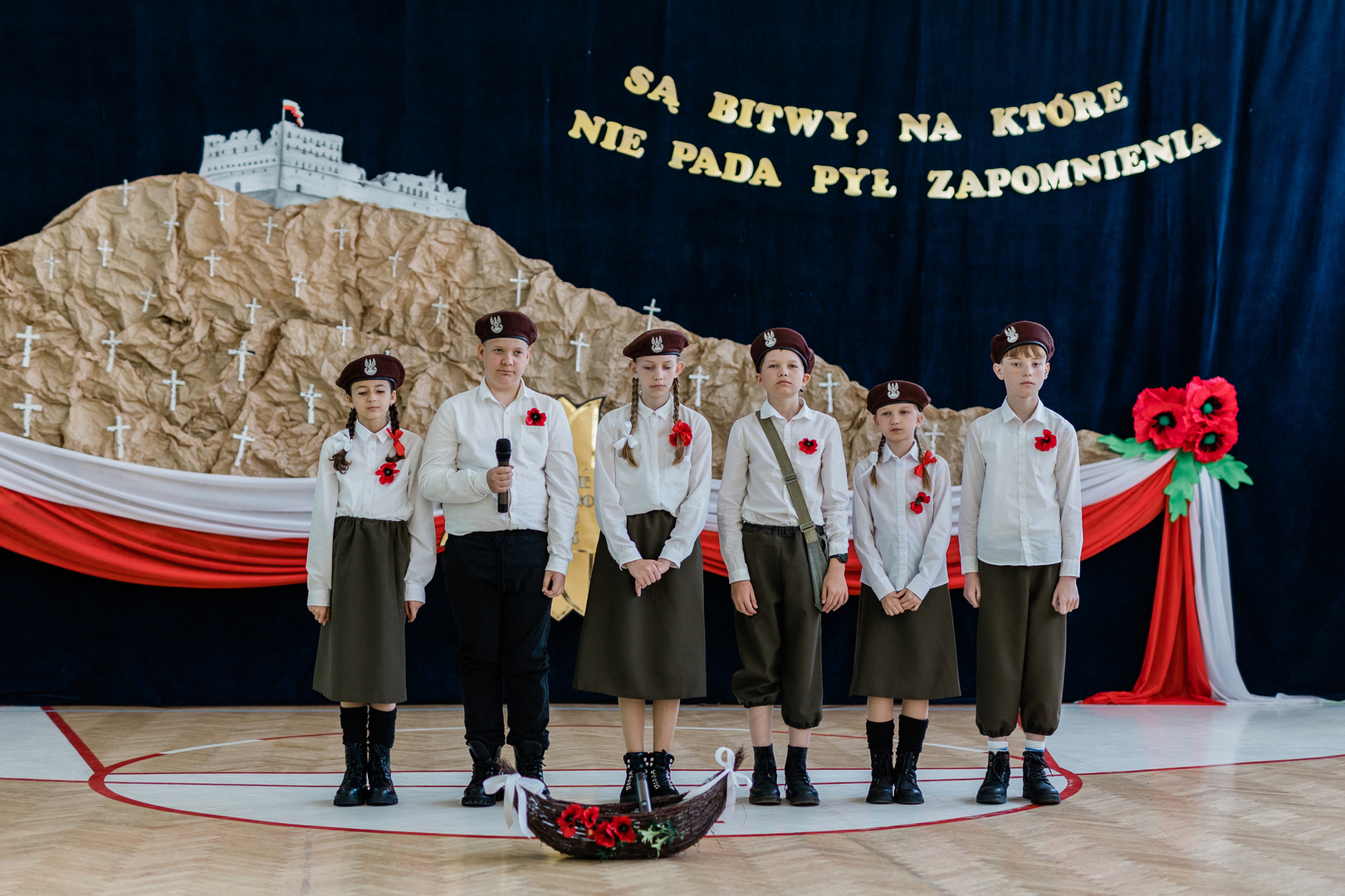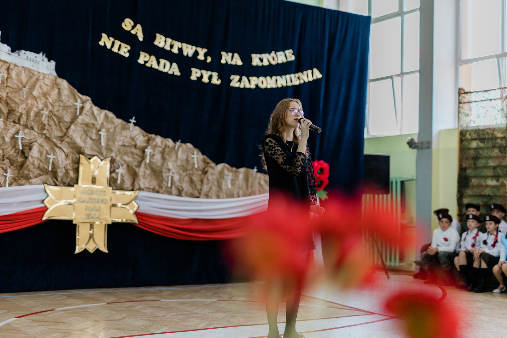 Niezapomnianych wzruszeń dostarczył zaproszonym gościom i uczestnikom występ uczniów w montażu słowno – muzycznym Są bitwy, na które nie pada pył zapomnienia. Należy podkreślić, że w uroczystości wystąpiła większość uczniów, przedszkolaki, a także absolwentka szkoły. Piosenki patriotyczne; m.in. : Uwierz Polsko, Czerwone maki, Piosenka o Wojtku, recytacje wierszy, wspomnienia żołnierzy, apel poległych oddały piękno i tragizm tamtych majowych wydarzeń 1944 roku. Zatknięcie biało – czerwonej flagi na ruinach klasztoru zostało upamiętnione efektownym tańcem z flagami. Przejmującą wymowę na zakończenie miała piosenka Stanisławy Celińskiej Modlitwa o pokój. Wojna na Ukrainie uczy, że nic nie zostało nam dane na zawsze. O wolność i pokój musimy dbać. Publiczność i zaproszeni goście byli pod wrażeniem talentu uczniów, strojów, pięknej dekoracji. Szkolni artyści zebrali zasłużone brawa i gratulacje.