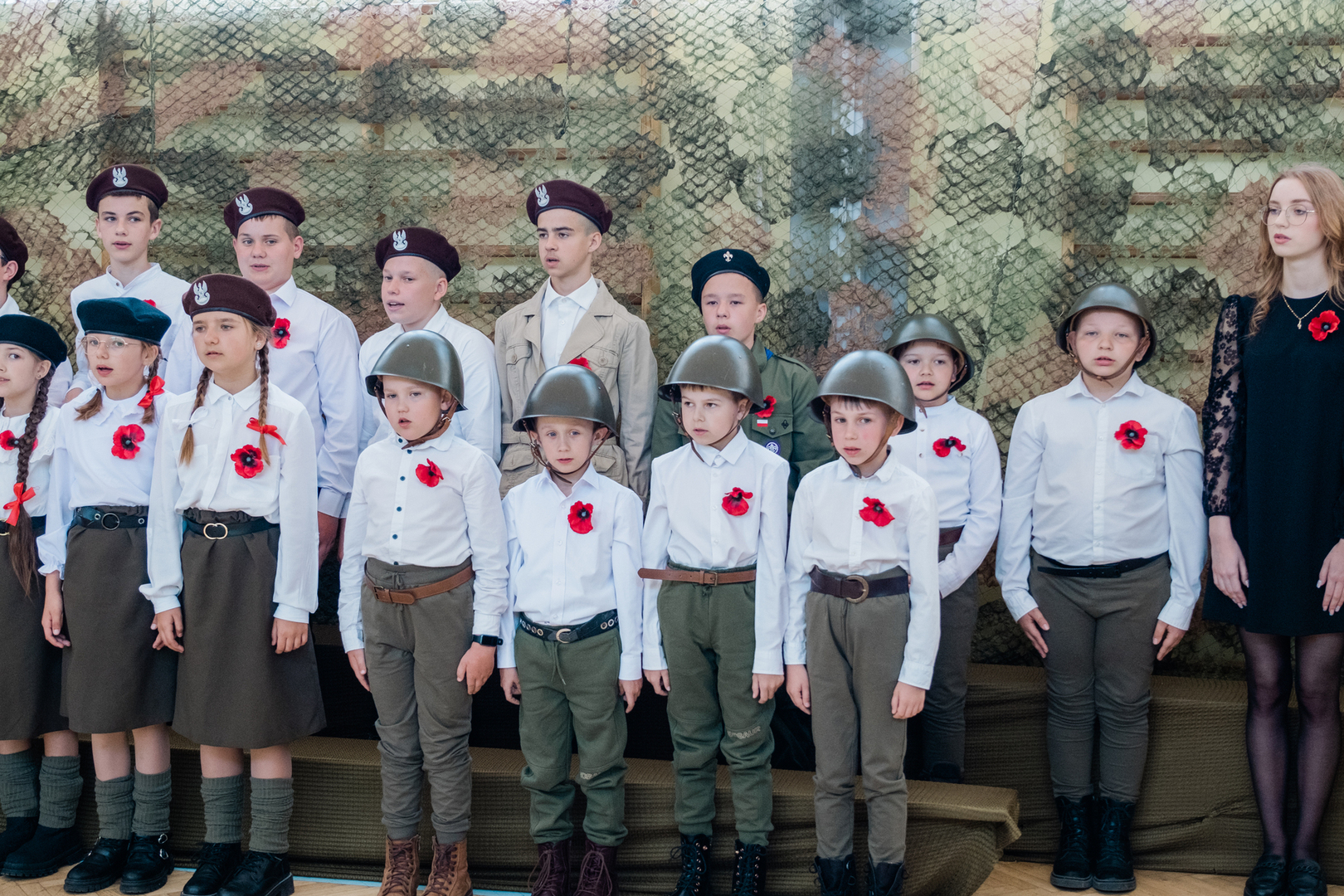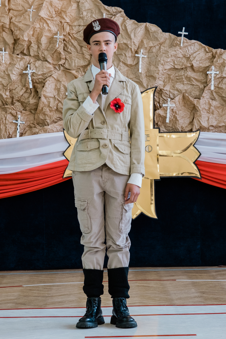 Wprowadzeniem sztandaru szkoły i odśpiewaniem hymnu rozpoczęto szkolną akademię. Pani dyrektor Olga Muszyńska w przemówieniu zacytowała słowa weteranów - żołnierzy 2. Korpusu Polskiego, skierowane do młodzieży :