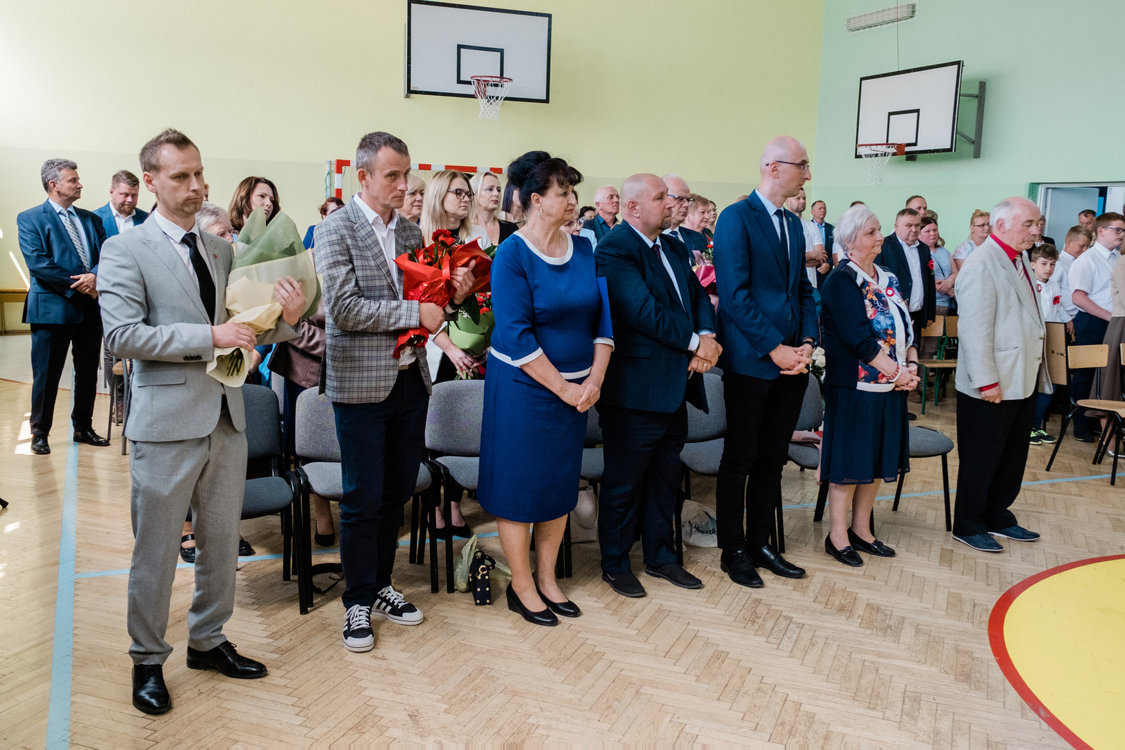 W uroczystości wzięli udział zaproszeni goście: przedstawiciel Starostwa Powiatowego w Jędrzejowie – Członek Zarządu Powiatu Jędrzejowskiego Zofia Stanek, Burmistrz Miasta i Gminy Małogoszcz Paweł Król; naczelnik Delegatury Instytutu Pamięci Narodowej w Kielcach dr Robert Piwko, Burmistrz Miasta i Gminy Małogoszcz w latach 2018-2024 Mariusz Piotrowski; pełnomocnik zarządu firmy Elerte Sławomir Trybek, dyrektor Domu Kultury w Małogoszczu Paweł Krzysztofik, radni Rady Miejskiej w Małogoszczu : Maja Kowalska, Paweł Kaleta, Janusz Paździerz, kierownik SCO Małogoszcz Małgorzata Adamek, inspektor do spraw oświaty Beata Świerczyńska, dyrektorzy szkół i przedszkoli z terenu Miasta i Gminy Małogoszcz, pułkownik rezerwy Straży Granicznej Grzegorz Otręba, komendant Szkolnej Grupy Przysposobienia Obronnego Jacek Szymański, Mirosław Skrobot, emerytowani nauczyciele, pracownicy szkoły, sołtysi, rodzice, społeczność lokalna.
