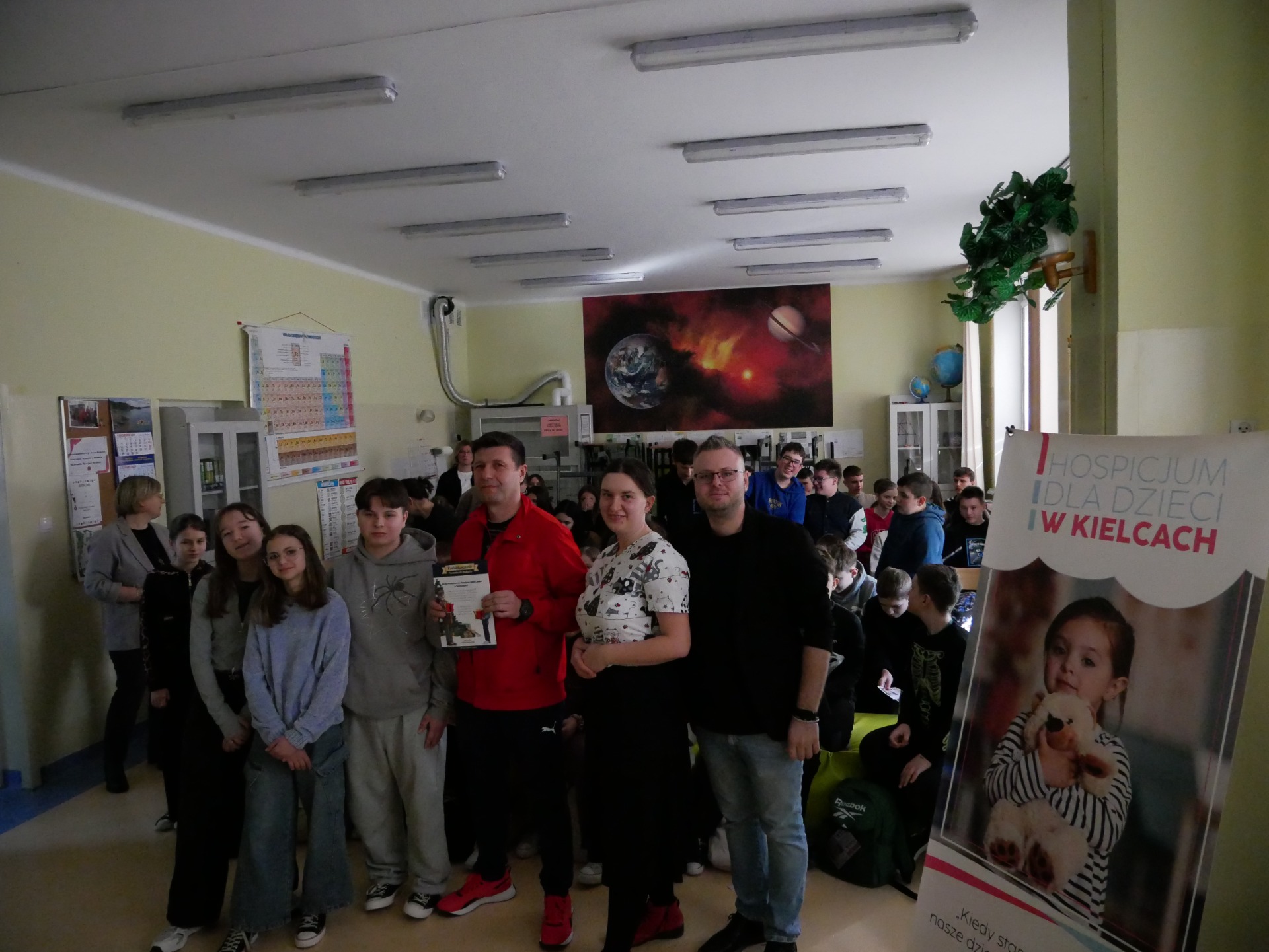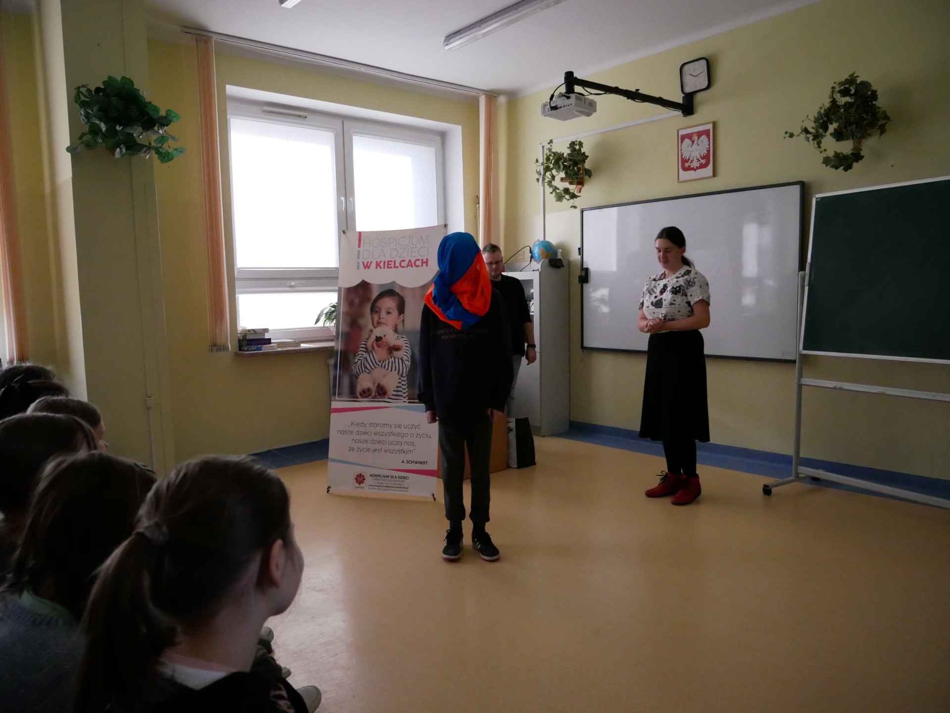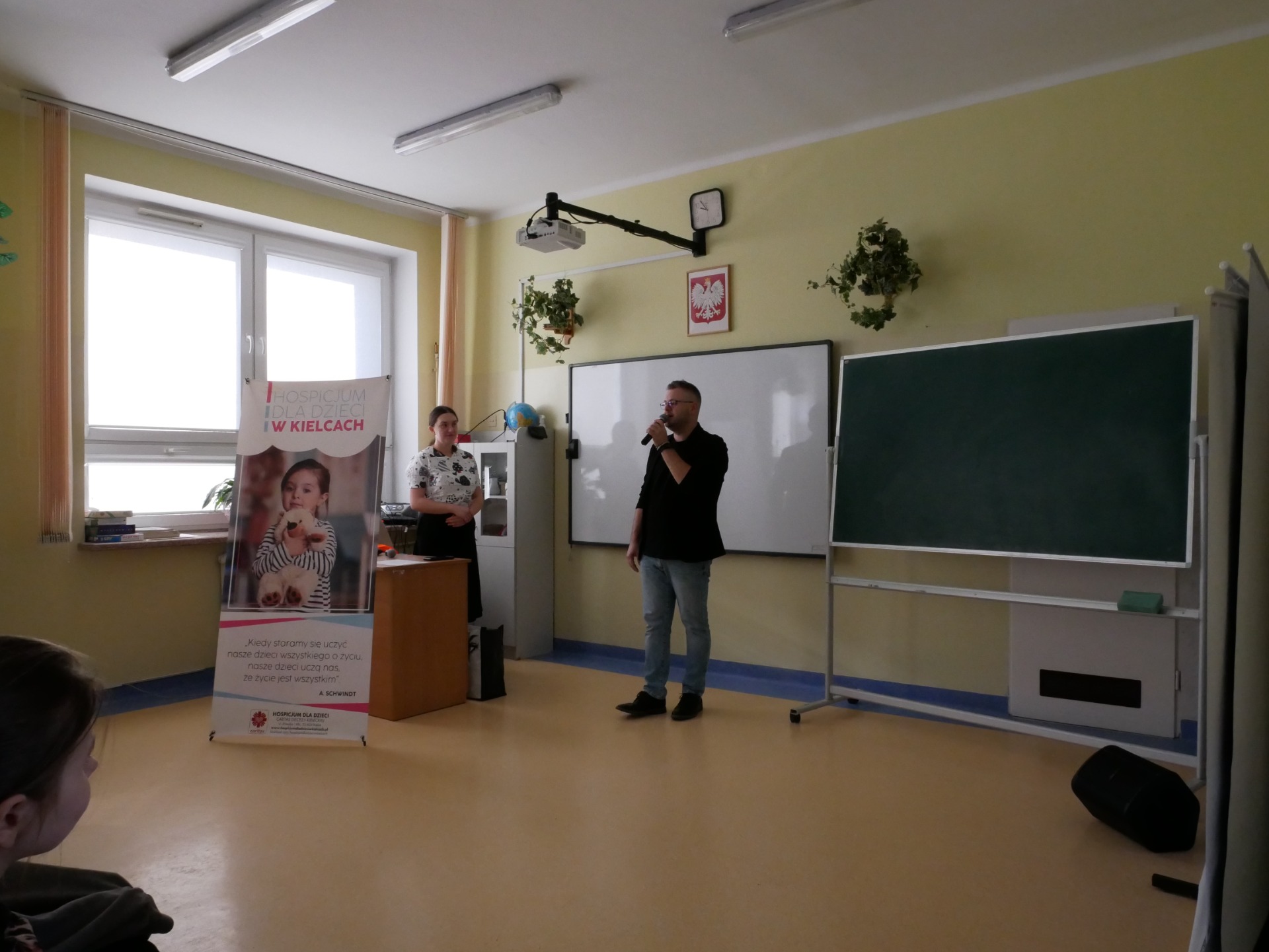 Serdecznie dziękujemy Państwu Angelice i Michałowi Steciakom za wyjątkową wizytę w naszej szkole! Podczas spotkania uczniowie mieli okazję posłuchać inspirujących historii oraz dowiedzieć się, jak ważna jest empatia i wzajemne wsparcie. Pani Angelika poruszyła trudny temat choroby, cierpienia i śmierci oraz opowiedziała o codziennym funkcjonowaniu hospicjum dla dzieci. Nasza szkoła aktywnie wspiera Hospicjum Dziecięce im. Matki Teresy z Kalkuty w Kielcach – już od dawna działamy na rzecz potrzebujących, a w ostatnim czasie Samorząd Uczniowski z własnej inicjatywy zorganizował kiermasz babeczek, którego dochód został przekazany na rzecz hospicjum. Pan Michał zaśpiewał, a Pani Angelika przypomniała nam, że warto cieszyć się każdą chwilą. Nasi goście nie tylko słowem, muzyką, ale przede wszystkim czynem pokazują nam, jak codziennie łączyć wrażliwość z radością życia. Ta lekcja empatii pozostanie w naszej pamięci i z pewnością zmotywuje nas do jeszcze większego zaangażowania społecznego, bo chcemy Razem być i Ładniej żyć.