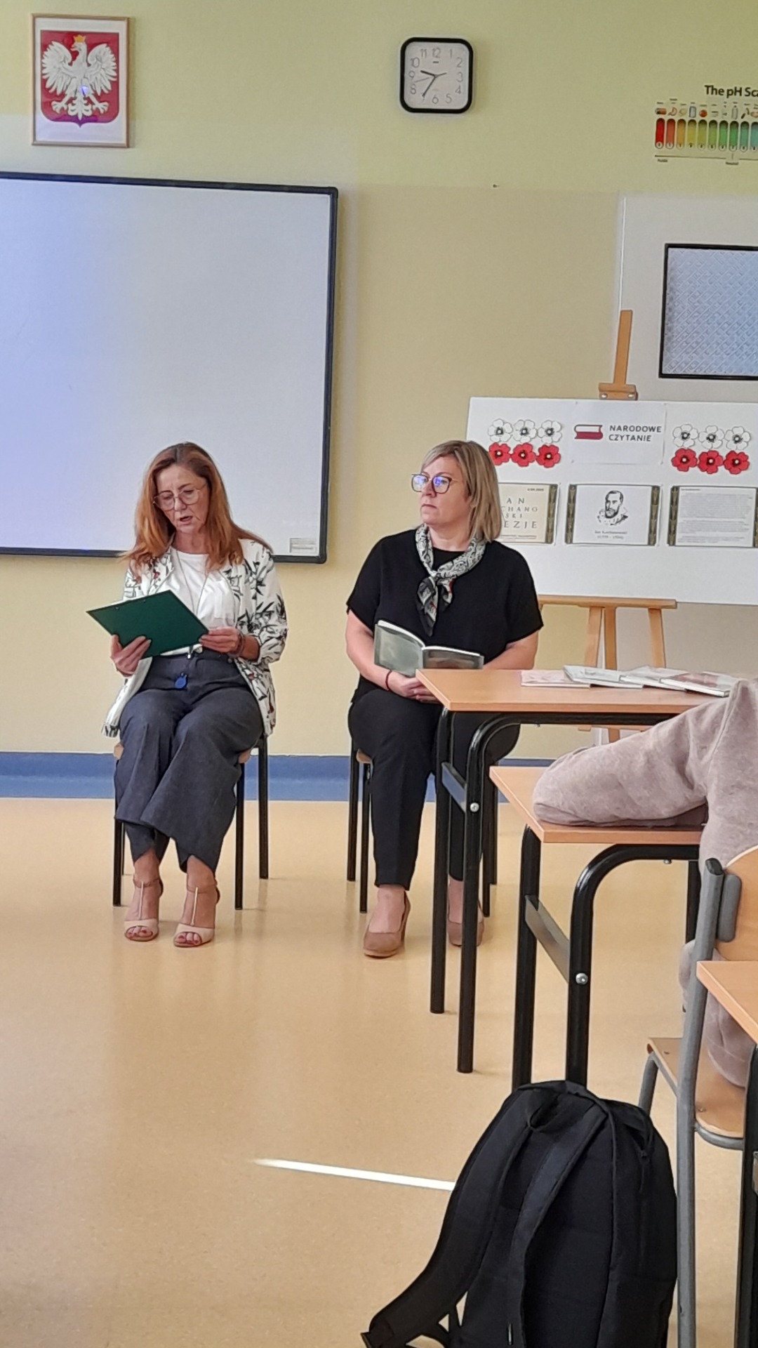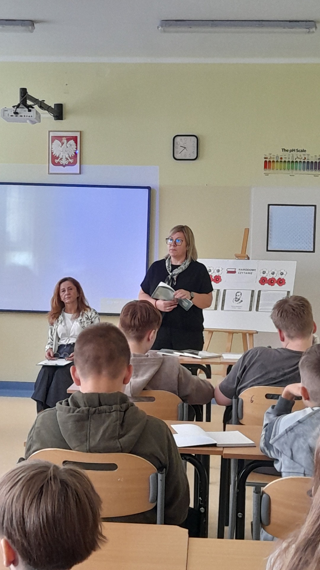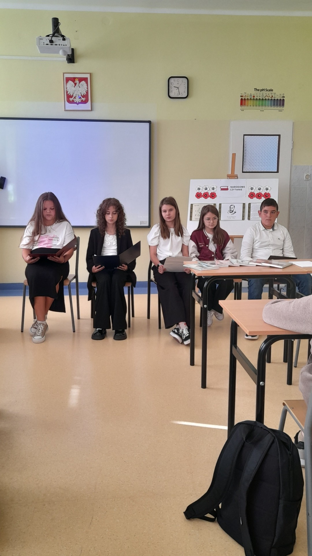 Narodowe Czytanie organizowane jest z inicjatywy Prezydenta RP od 2012 roku. Przesłaniem akcji jest m.in. popularyzacja literatury polskiej i zachęcenie do jej czytania. Bohaterem tegorocznej edycji był Jan Kochanowski. Uczniowie z klas VI i VII zapoznali się z sylwetką renesansowego twórcy. Wspaniale odczytali fraszki i pieśni Poety. Do akcji włączyły się nauczycielki języka polskiego, które ciekawie zaprezentowały pieśni i treny Mistrza z Czarnolasu. Podsumowaniem spotkania było przybicie okolicznościowej pieczęci. Dziękujemy za udział w tym niezwykłym spotkaniu czytelniczym i zapraszamy do częstego sięgania po dzieła literatury polskiej.